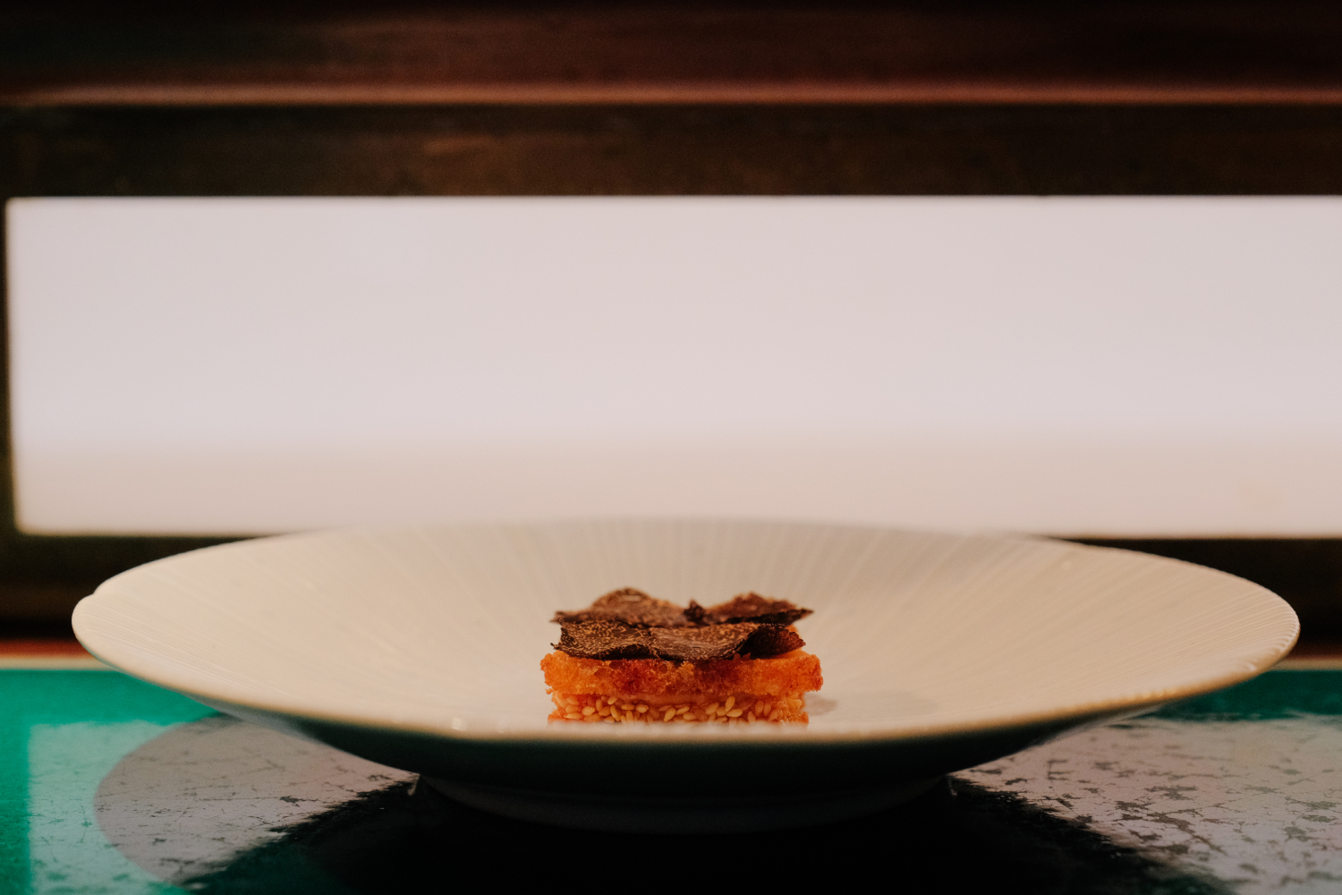 採訪當日端上桌的,是一枚戲稱有 999 層酥皮的干貝酥,這是一門指尖武功,每一層酥皮皆等寬,薄如蟬翼,層層分明卻不碎散。經典的腸粉,他也玩出新意;他巧妙夾入中東常用的磚泥薄皮(Brick pastry),捨棄了英國慣用的油炸腐皮,這層薄皮在柔軟的米香與醬汁間,撐起了一種鬆散而輕盈的脆度,口感層疊交錯,極其迷人。芋角結合黑椒牛肉,上頭以酥脆山藥片增加層次。燒肉蝦膠的脆皮展現完美的火候控管,與黑松露形成絕妙搭配。