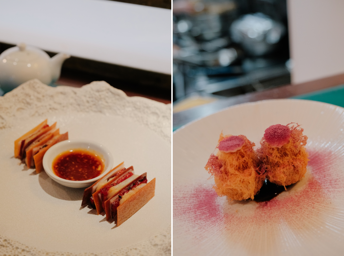 Andrew 在腸粉(左)間夾入中東常用的磚泥薄皮,將經典翻玩出新意;芋角(右)結合黑椒牛肉,上頭以酥脆山藥片增加層次。