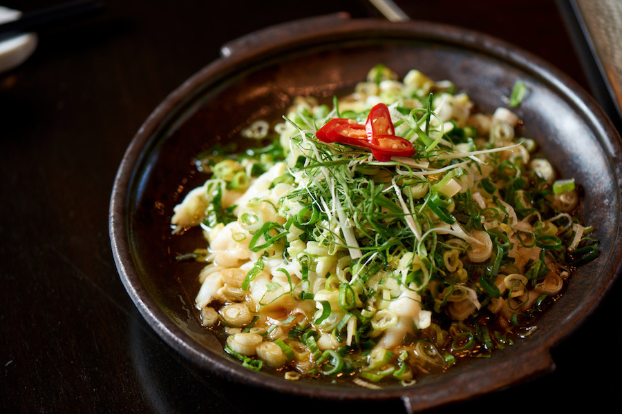 另一個讓謝文讚不絕口的食材是三星蔥。蔥容易出黏稠的汁液,但三星蔥怎麼料理都很清爽,跟海鮮更是絕佳搭配。「蔥香海斑柳」就用了大量三星蔥,燙熟的石斑魚片放上蔥末,熱油一澆下,蔥香味隨著高溫蒸騰四溢。
