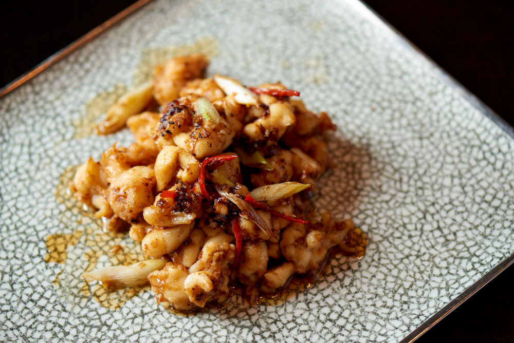 「豉汁炒龍蝦球」用的就是澎湖龍蝦。這道菜是以前福臨門的菜色,為了讓賓客不用動手撥殼,料理前得先將龍蝦凍個 8-10 分鐘,才好去殼取出完整蝦肉。過去沒有太多餐廳做這道菜,會的廚師不多,還好謝文到雅閣後重現這道料理,豆豉的鹹香與龍蝦的鮮甜恰成對比,蝦肉的紮實與彈性更不在話下。