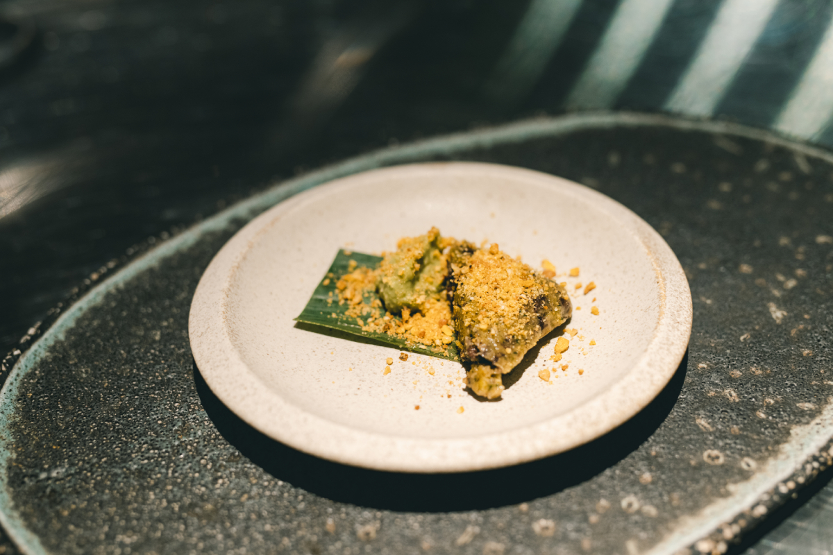 將 2 湯匙的玉米粽餡料以香蕉葉妥善包裹。Add 2 tbl spoon of the tamal filling and wrap it with the banana leaves until well sealed.