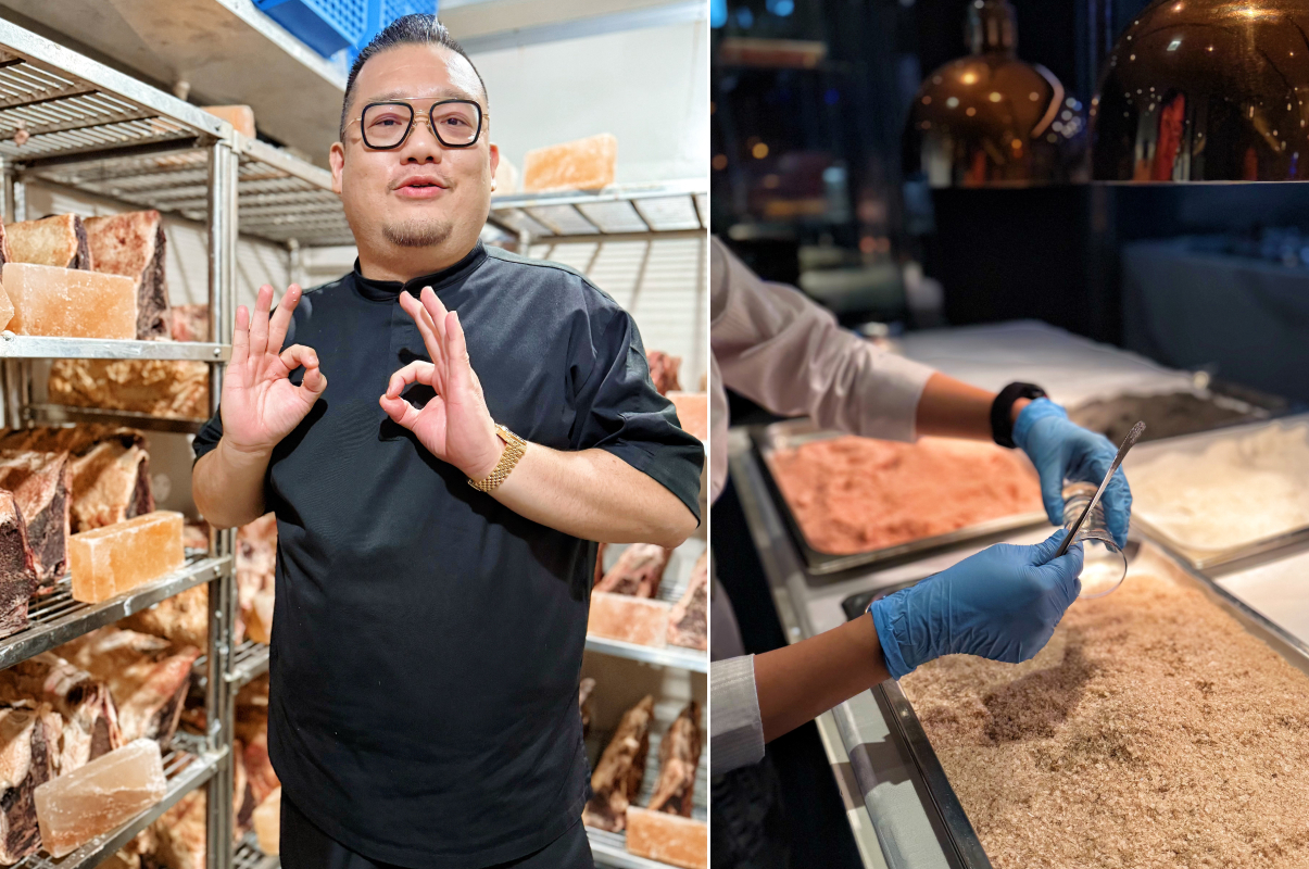 台灣能入口的牛肉選擇不多,除了嚴選產地和農場,凌維廉還透過把控嚴謹的乾濕兩種熟成方式來提升牛肉的風味表現。離開餐廳時,看見員工把餐桌上給客人用的鹽一一倒出來在燈下曬──原來主廚規定員工每天都必須執行這個「曬鹽」程序,以免鹽巴因受潮變質,繼而影響了牛排的味道。一點細節和堅持,看到主廚是個做事有高要求的人。