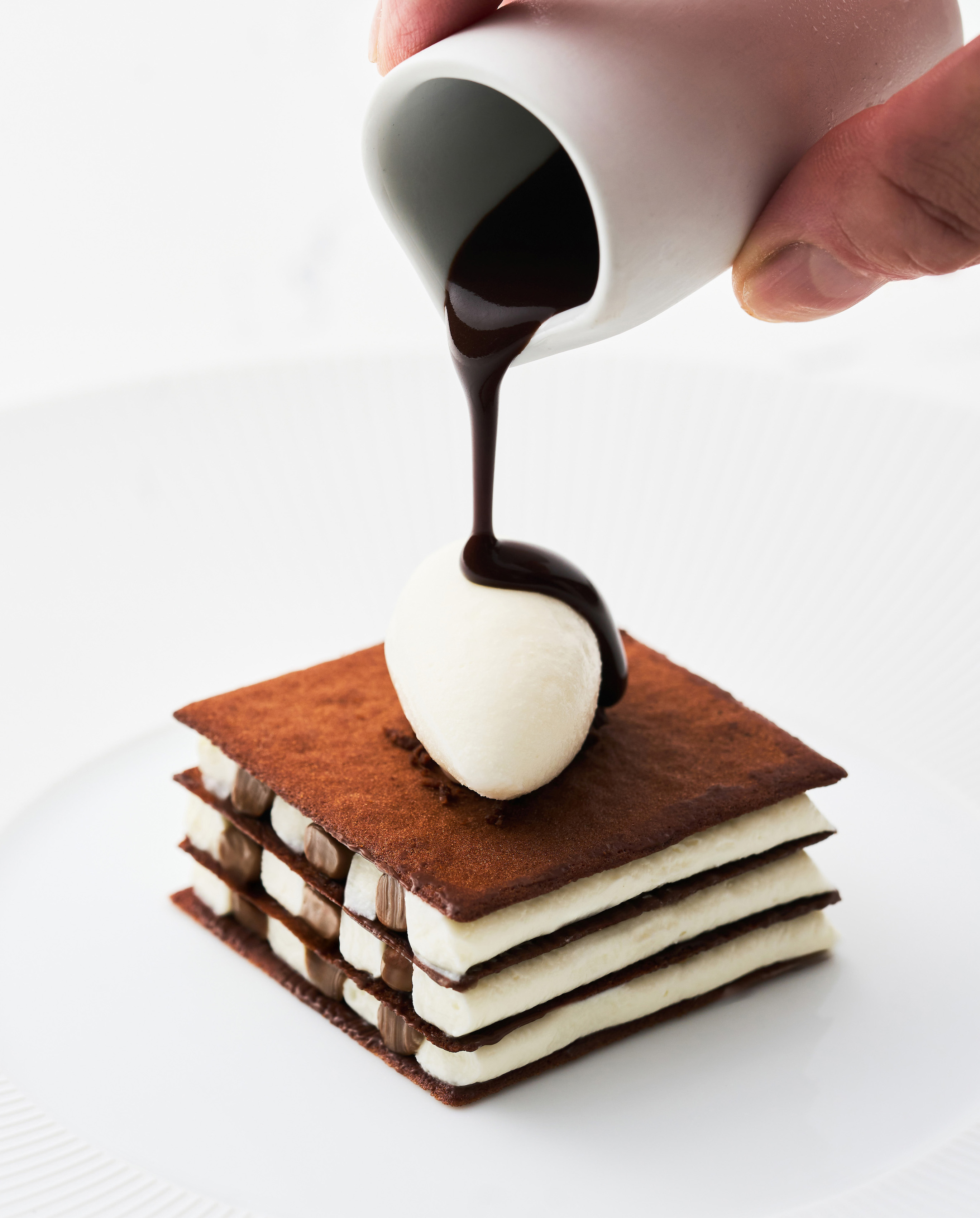 由巧克力、牛奶、咖啡和糖攪打而成的 Barbajada,是米蘭的特色飲品,在 FRASSI 化成甜點上桌。方正的巧克力脆片間,由馬斯卡彭香緹和咖啡慕斯撐出立體感。一球牛奶冰淇淋在頂端置中,服務生淋上的濃稠巧克力醬緩緩流過雪白的冰淇淋,沿著立面傾瀉而下,在幾何的規律中創造自由的美感。