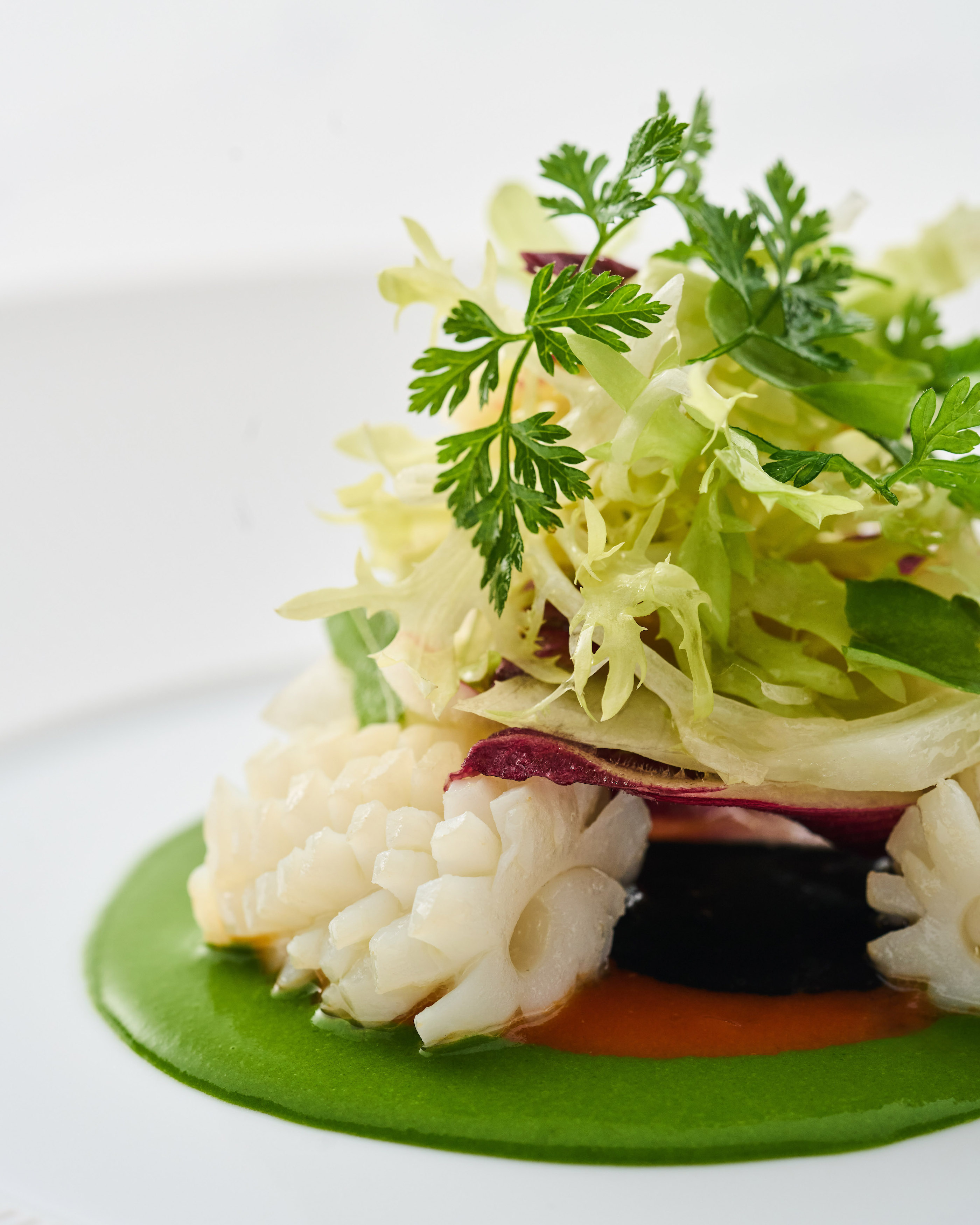 米蘭不靠海,每當 Iacopo 想念海鮮滋味的時候,他得前往南方的海港城市熱內亞。前菜「現流槍烏賊 巴西里 菊苣」重現他不遠千里只為一嚐海鮮的心願,也是他向義大利第一位米其林三星主廚 Gualtiero Marchesi 致敬。