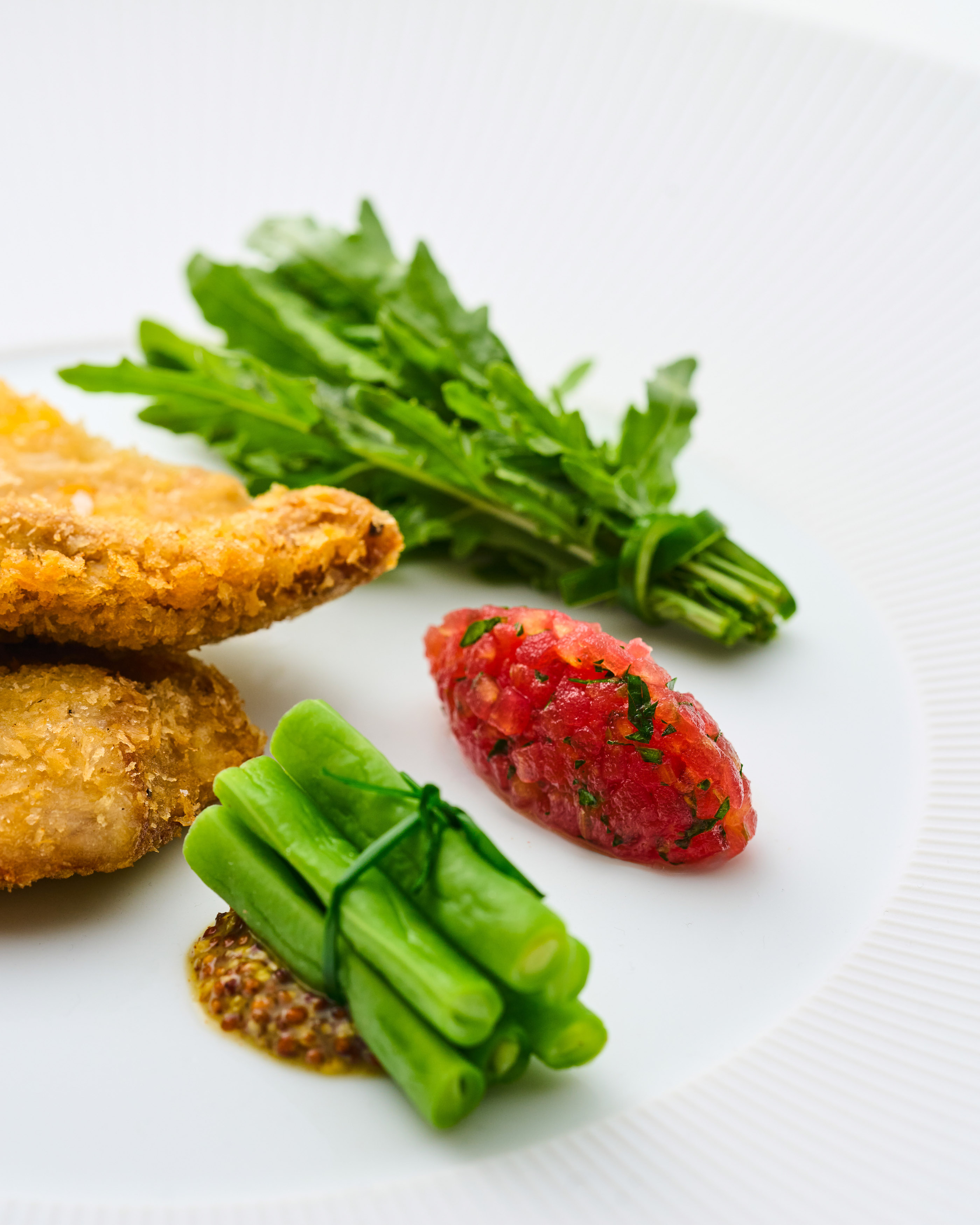 在盤中的炸小牛排旁,柚子椪醋佐芝麻葉、拌入柚子胡椒的番茄碎,跟墊著接骨木芥末醬的新鮮四季豆一字排開,在酥炸小牛肉之後帶來一股宜人清新。「蔬菜的季節搭配我會做得比較現代,但整體仍以傳統風格為主。」以鹽麴醃漬小牛肉的做法,也讓義大利料理多了和風色彩。