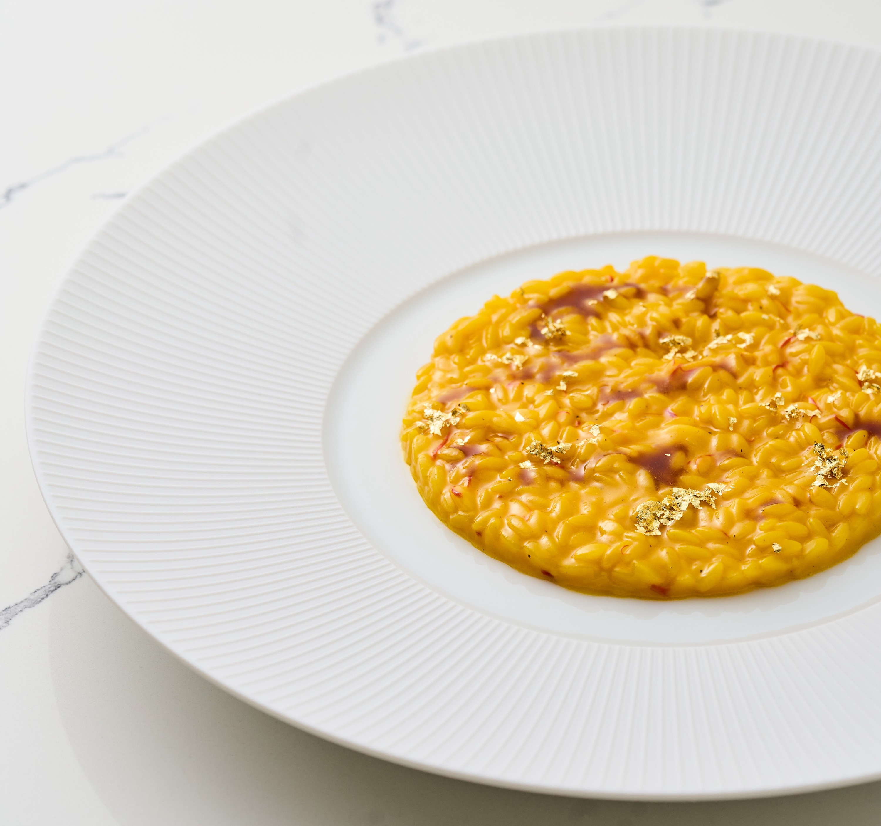 米蘭燉飯是將義大利米加入雞高湯慢煮,再以番紅花染出金黃色澤及獨特芳香,最後加入帕瑪森起司,也有搭配牛骨髓的版本。Iacopo 十多年前曾於米蘭燉飯比賽獲得冠軍,他將冠軍作品帶進午間菜單,但加入新的創意,例如盤中粒粒分明的米,其實是義大利麵。