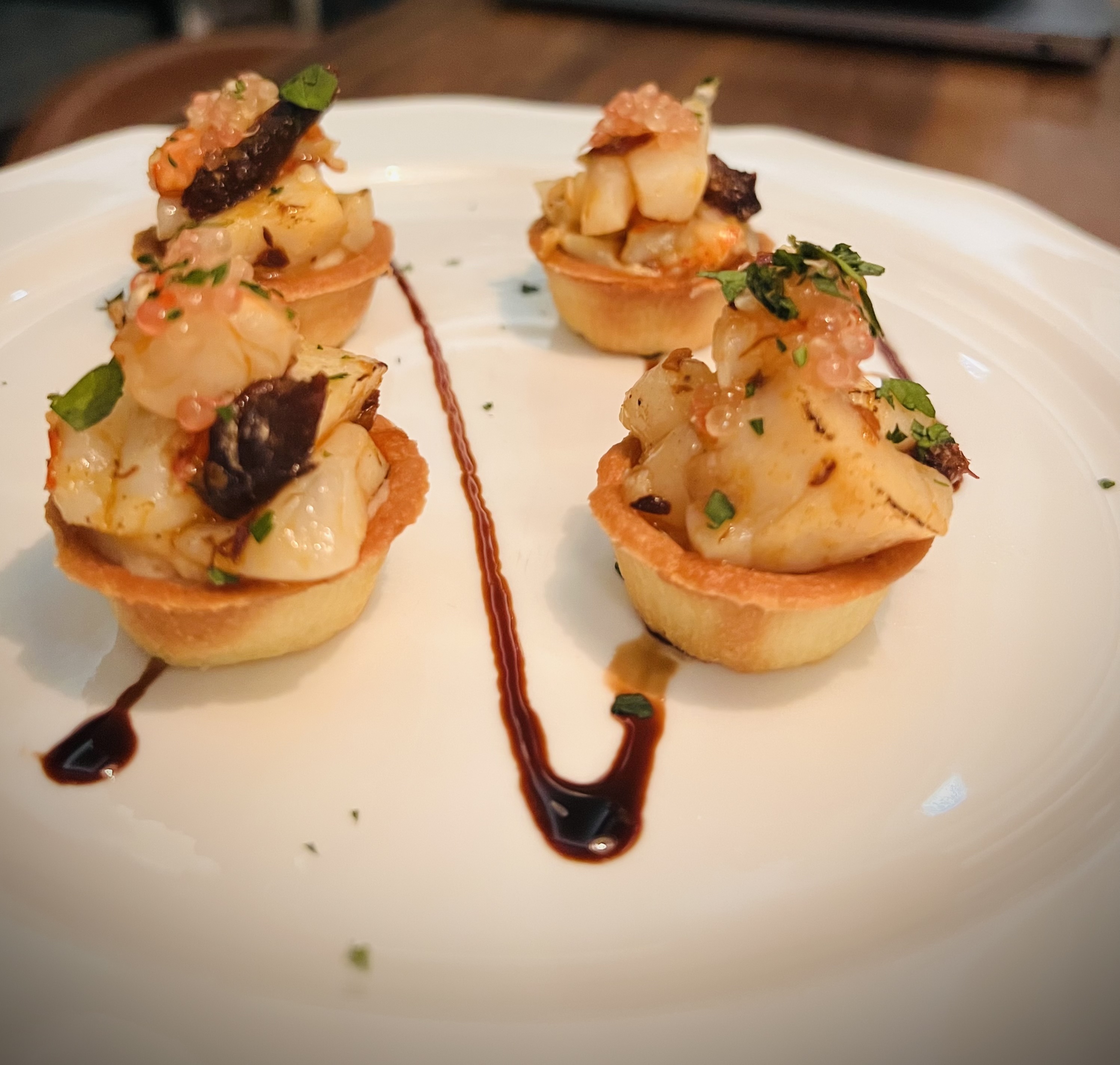 Roma Roma Pizzeria & Bar 主廚黃聖祐嘗試將飛魚辣醬應用在義式餐桌上,製作開胃菜西西里海鮮塔。「這道料理靈感來自西西里海鮮料理與埃特納火山。」底層使用栗子起司泥與塔皮中和辣味,上層放上生食干貝與炙燒天使蝦與飛魚醬,最後以柚子果肉和綠檸檬皮點綴,酸辣平衡,風味清爽。