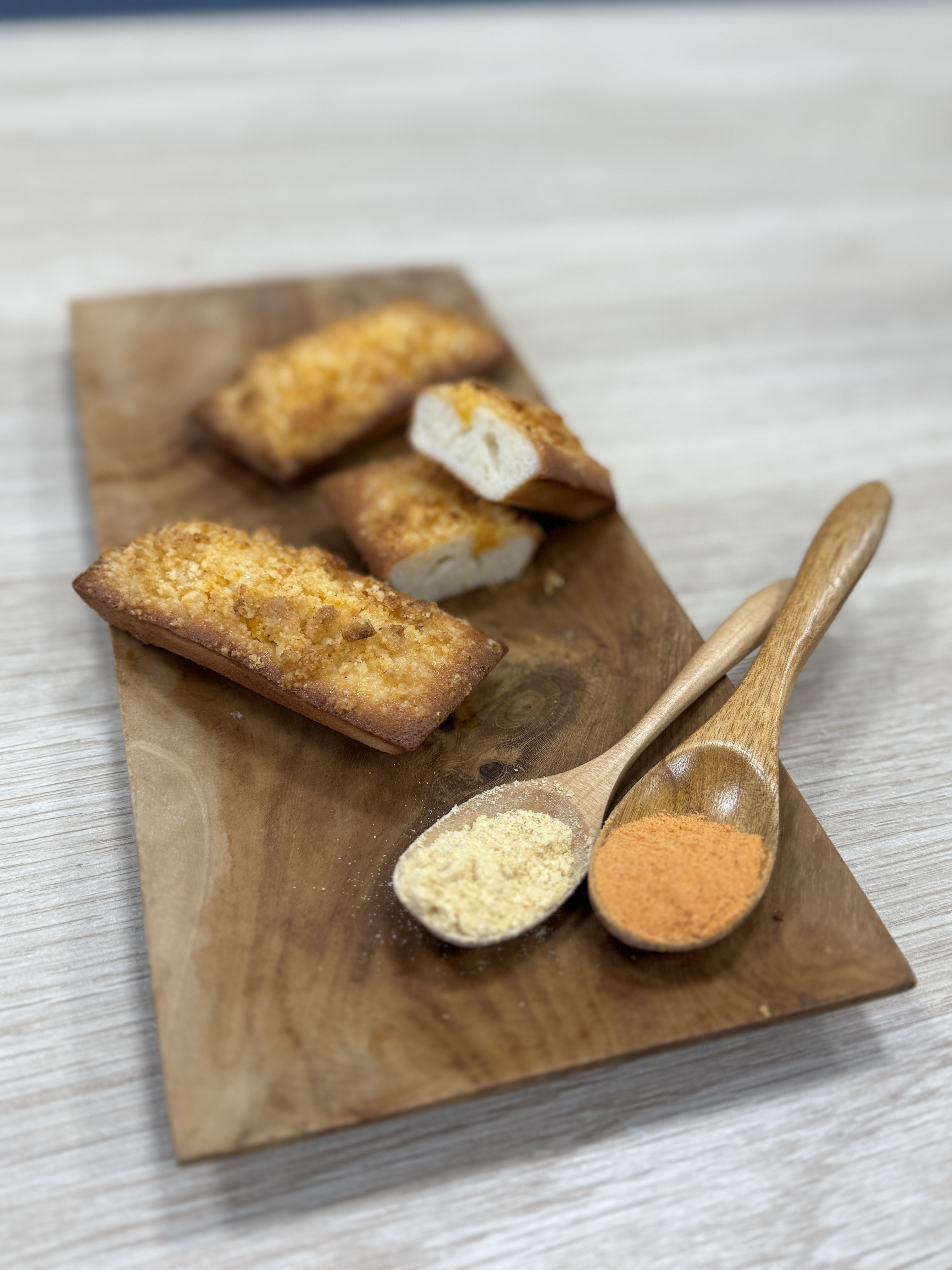 五星飯店西點主管 Edalyn 主廚則將墨西哥紅椒與金沙調味粉結合,推出鹹蛋黃費南雪。「大家對鹹蛋黃甜點已不陌生,但墨西哥紅椒的煙燻感能把金沙鹹蛋黃的濃郁拉出更多層次。」她指出,愛可米烘焙調味粉以乾燥粉體呈現,只需添加約 3% 至 5% 即可提升風味,操作上便利且穩定。「我自己最愛的用法,是加在鹹派的蛋水裡。很多人做鹹派常遇到的問題:蛋液味道被塔皮或餡料蓋過,覺得略顯單薄。但加了墨西哥紅椒風味後,整體香氣立刻更突出。」