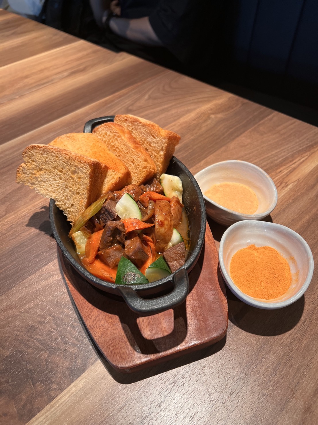 一極肉鋪餐廳主廚 Carlos 郭桐維則用超濃起士調味粉揉入佛卡夏麵糰,讓麥香與乳香在發酵過程中自然融合。「能在長時間發酵裡保留香氣層次,又省去反覆調整比例的時間。」他也以墨西哥紅椒調味粉為和牛牛舌入味,以紅椒香氣串聯蔬菜與肉汁,達到平衡與深度並存。