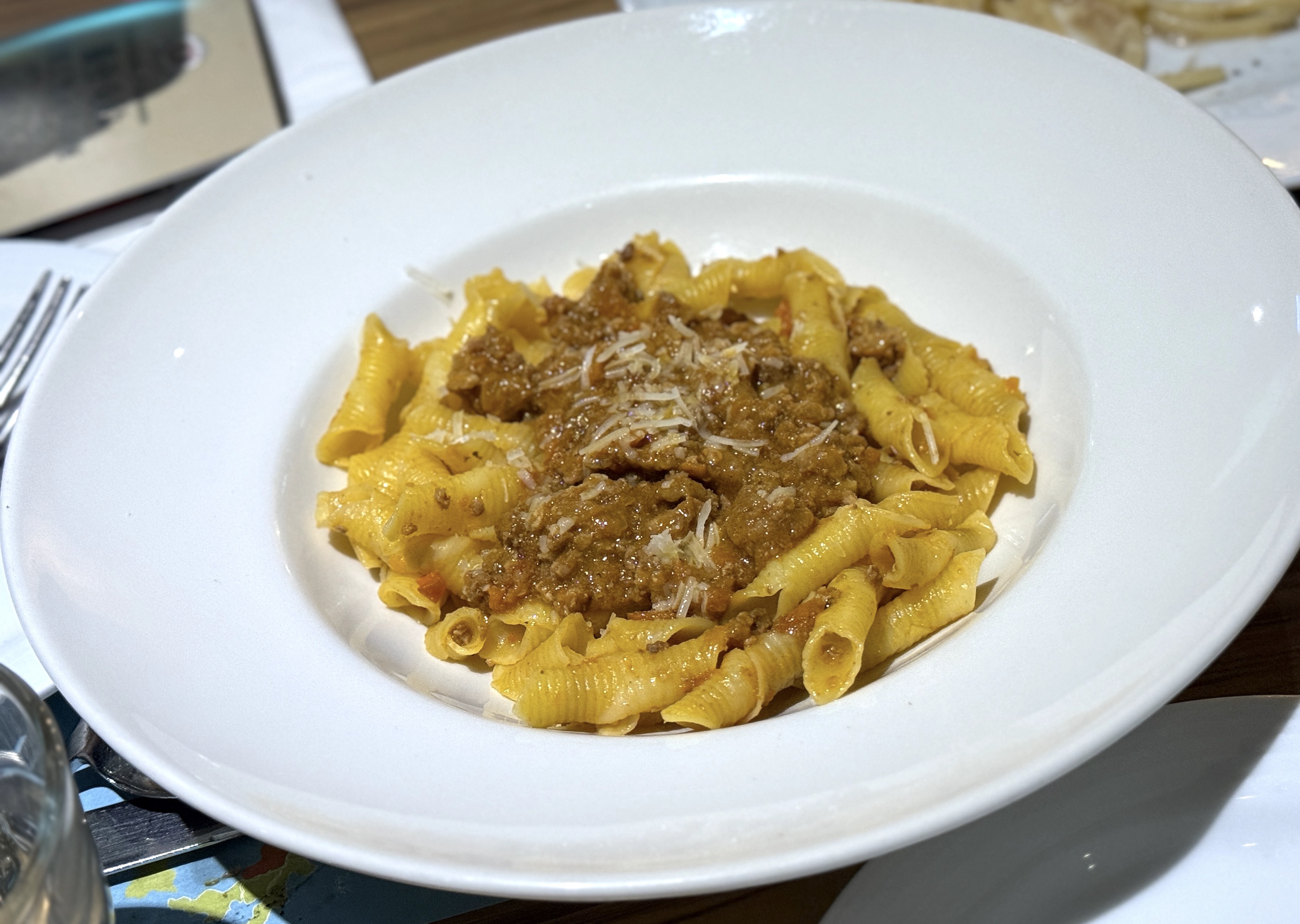 溝紋蛋捲麵是用一片方形的麵體捲成管狀,煮熟之後,中央交疊處口感較硬,而兩端偏軟,軟硬兼具是這款麵的特色。平常 Solo Pasta 的肉醬肉末粗大,他為捲麵將絞肉切得更細。「醬跟麵條的關係是很重要的,你要看得出它們有纏綿的感覺。」因此,他做出肉末細小的肉醬來配合捲麵,讓醬汁和肉末能深入管狀麵體,讓每一口麵都有滋有味。