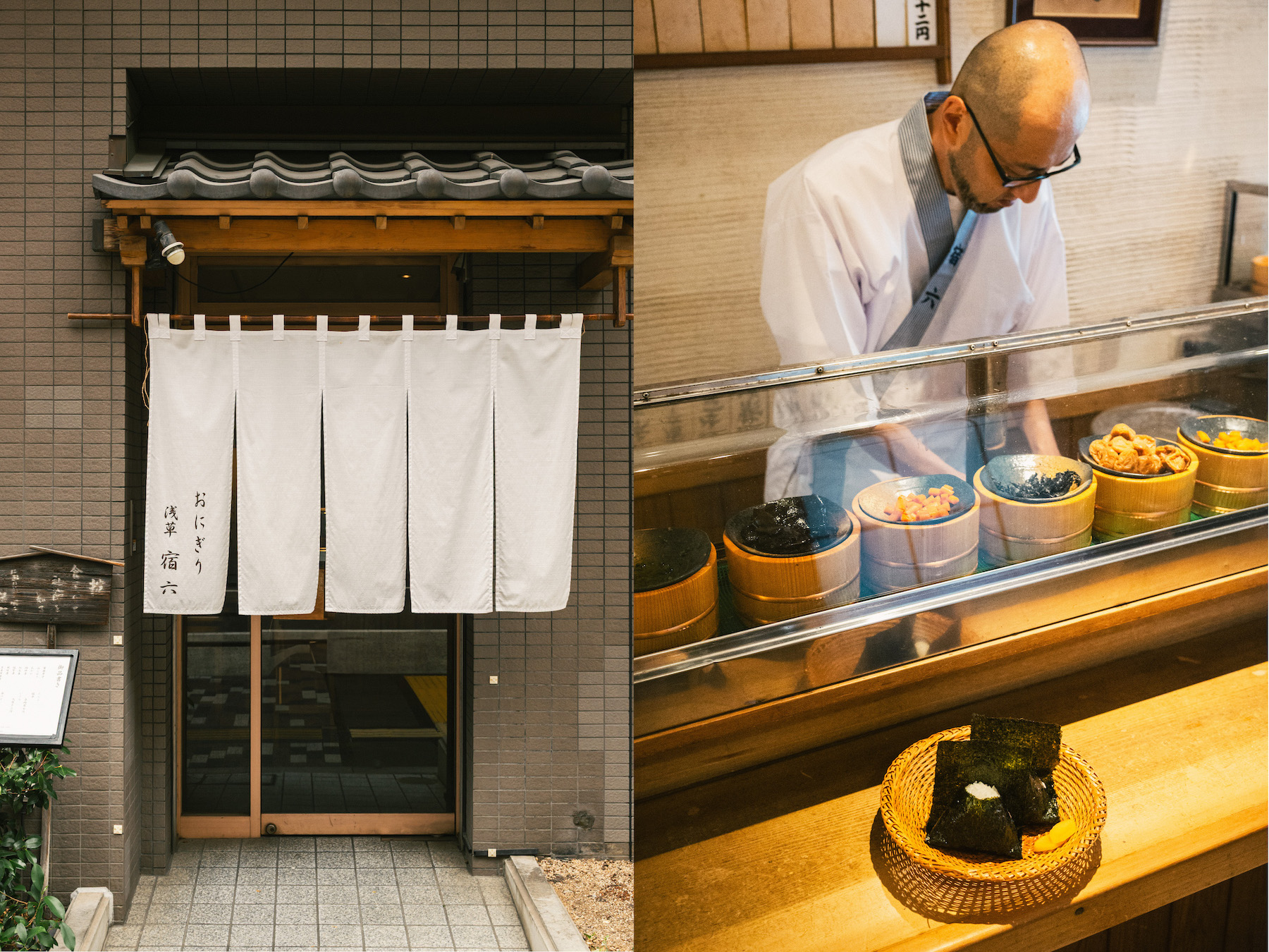 淺草宿六創立於 1954 年,「我都自稱我們是東京最古老的飯糰店。」主廚三浦洋介笑著說。店名「宿六」是日本俗語,意思是「待在家裡不務正業的人」,這正是他祖父的寫照,祖母只好以捏飯糰扛起家計,並以「宿六」為飯糰店命名。第三代的三浦洋介原本是長笛手,後來返家與母親一起經營淺草宿六。現在淺草宿六是全球唯一入選米其林指南的飯糰專門店,並連續多年獲得必比登推薦,吸引許多在地人與觀光客造訪。