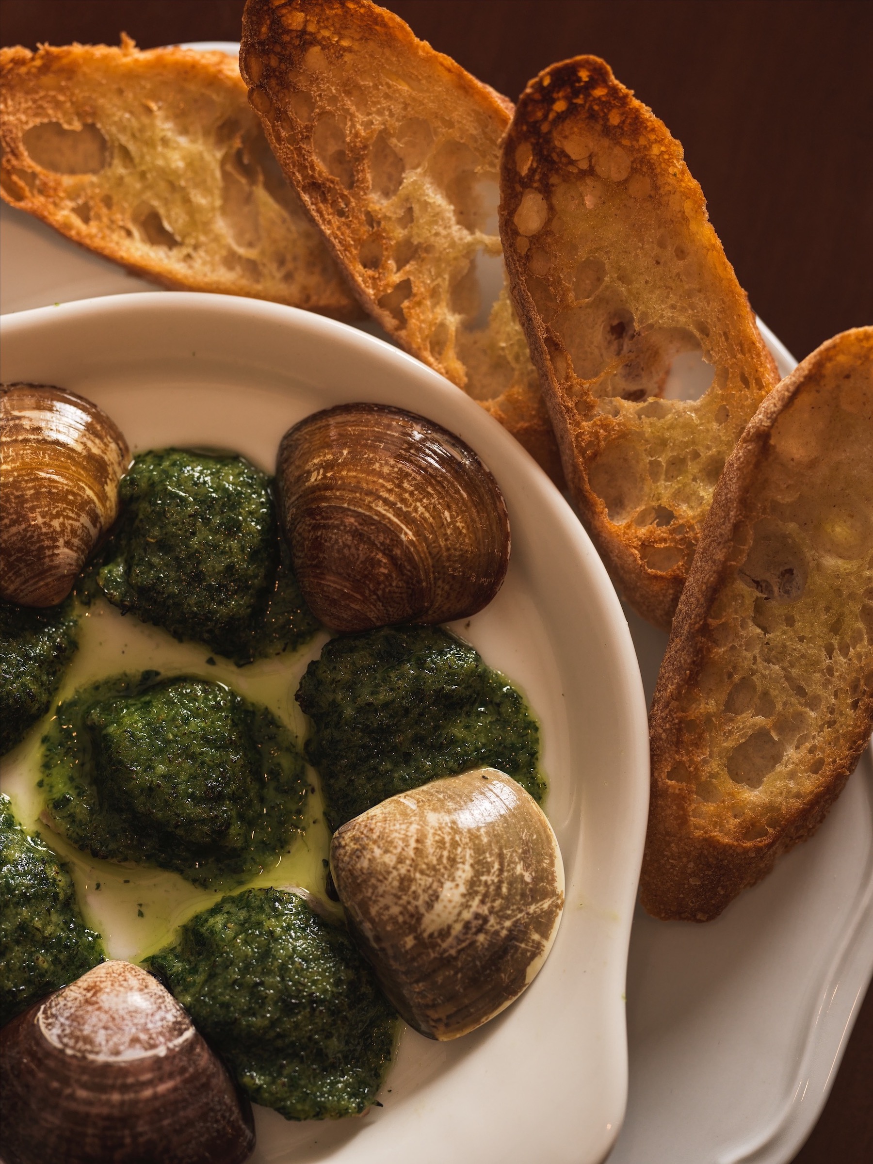 「大蒜香芹奶油烤大蛤」的原型為焗田螺,取代田螺的蛤蜊多了一股海洋的鮮美。