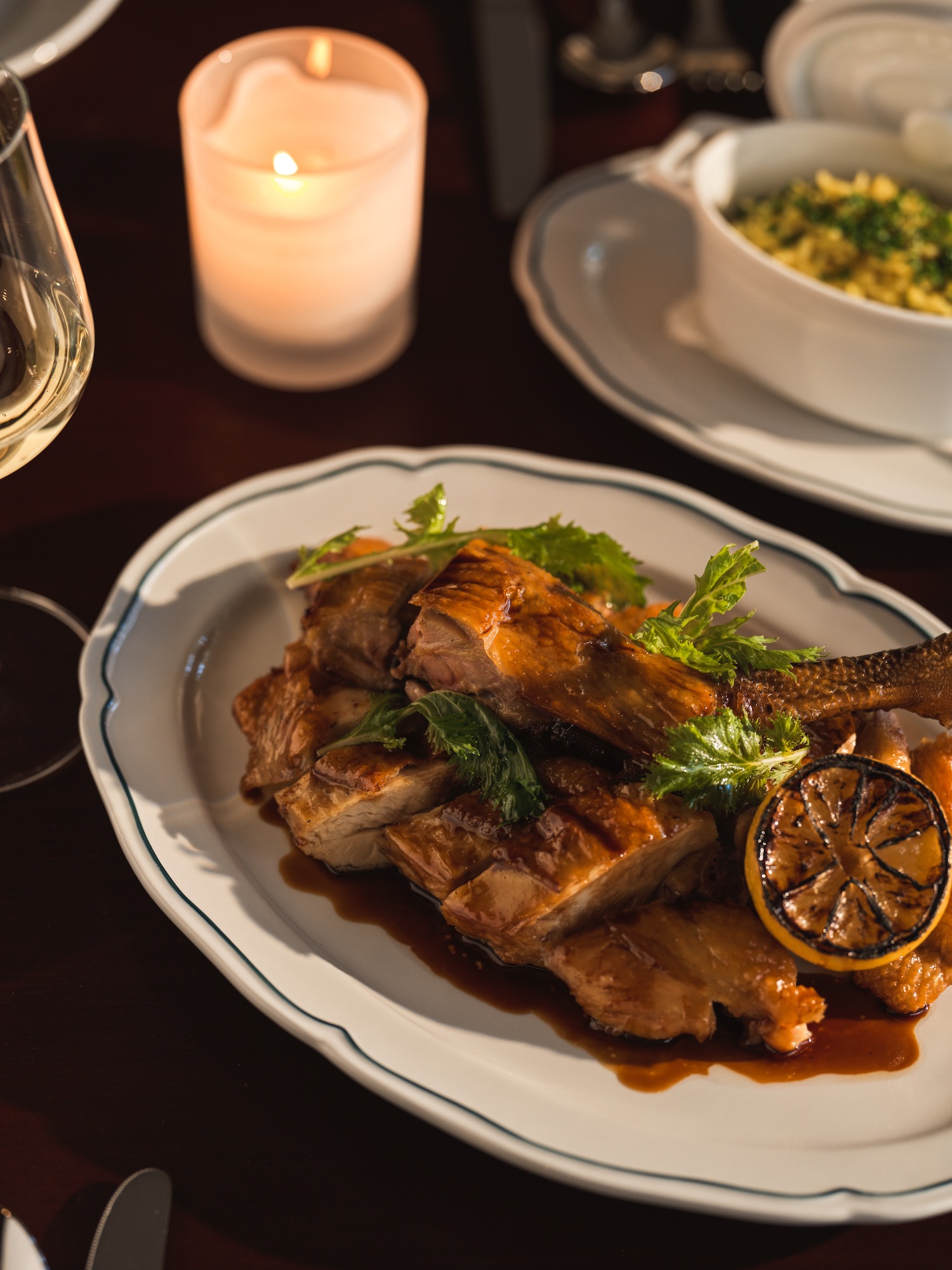 「法式爐烤雪巖雞・皮拉夫香料飯」用台灣雪巖雞做出皮香肉嫩的法式烤雞,配上噴香的皮拉夫香料飯。