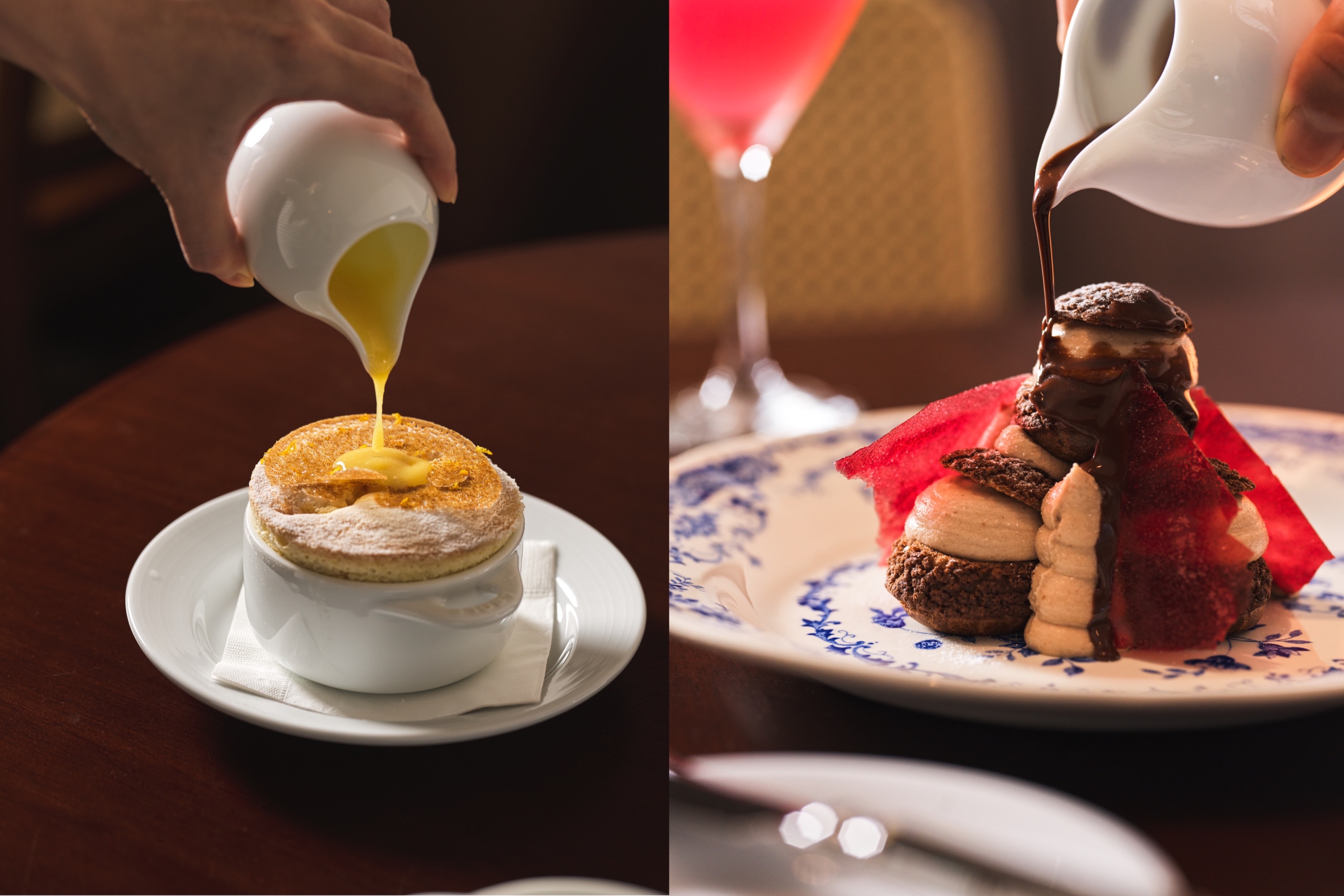 香橙干邑舒芙蕾(左)是擁有百年歷史的經典甜點。「洋梨巧克力脆皮泡芙」(右)則將大廚埃斯科菲的創作重新詮釋。