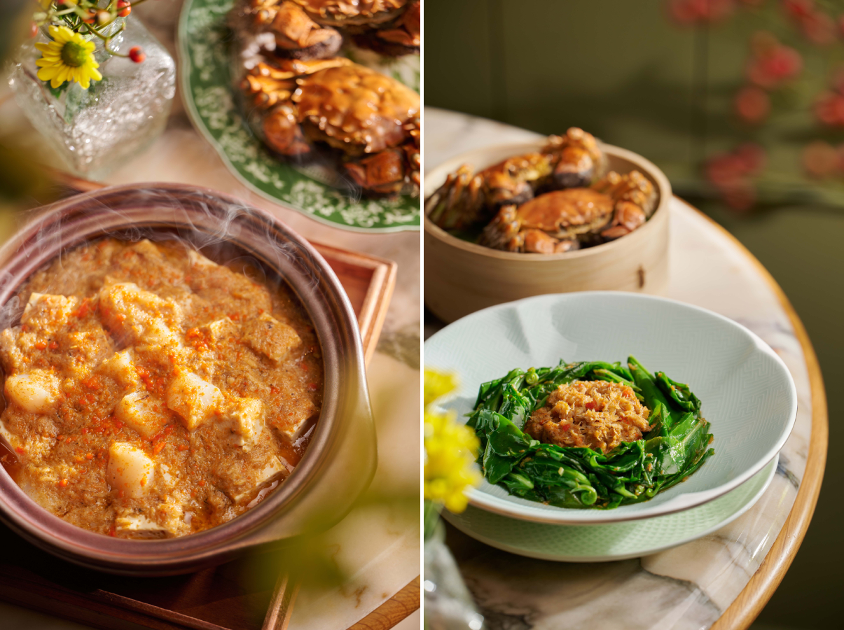 大閘蟹宴以永春老醋蟹肉凍打開序幕,接著是蔥絮蟹肉羹,然後是令人窩心的蟹粉海皇柯豆腐。品嚐輕盈優雅的蟹粉扒山蘇菜,迎接餐單的點睛之筆──清蒸大閘蟹(200 克)。緊接在後的是飄香蟹粉配煎麵線,最終以清新的甜點椰汁燕窩凍為這頓盛宴作結。