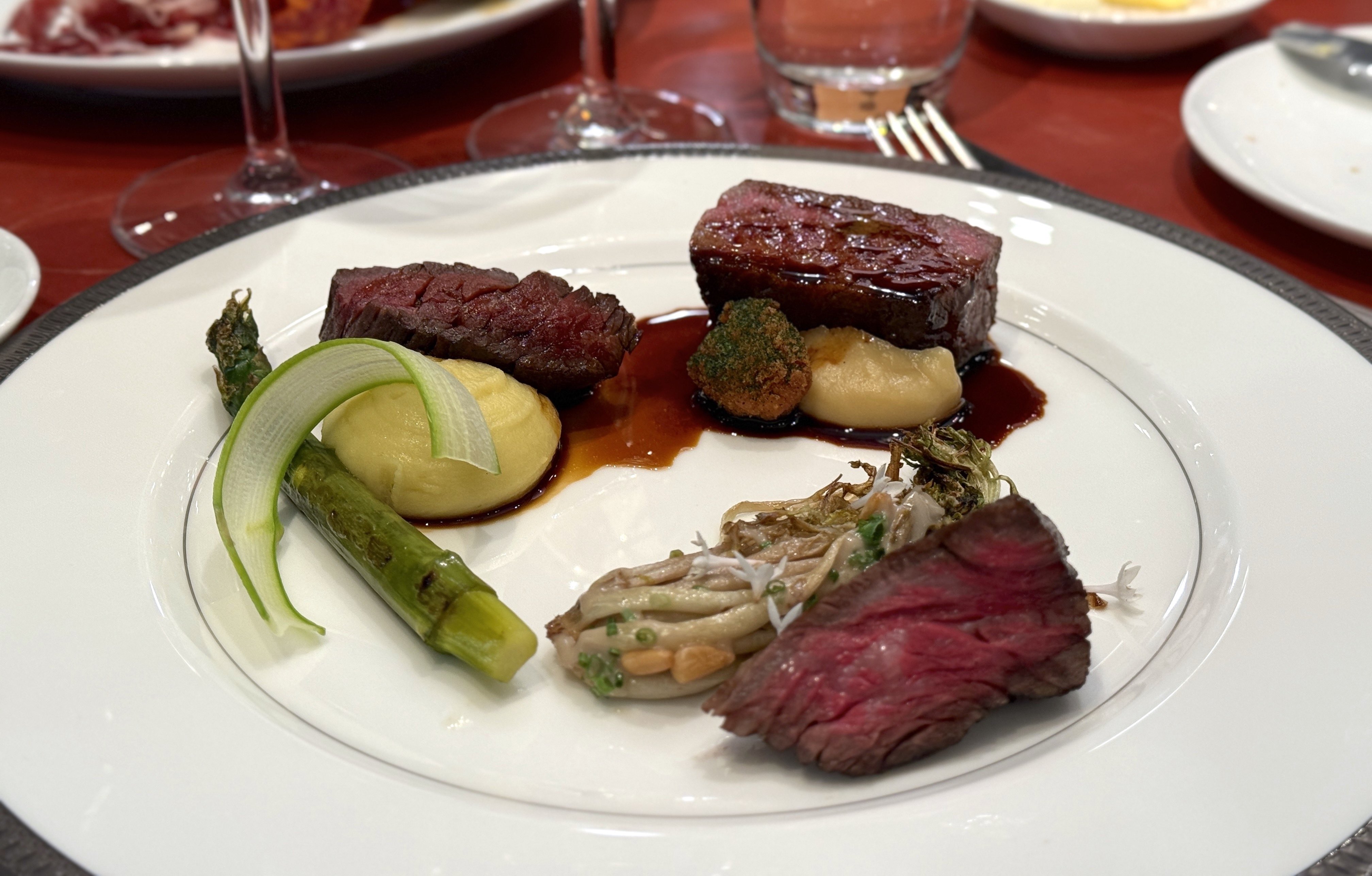 看過分切示範後,這些部位就要化作盤中珍饈上桌。貝爾加莫以 Jewel M9+ 的不同部位設計 3 道料理:油花綿密、俗稱「老饕肉」的肋眼上蓋,搭配鯷魚美乃滋與烤綠捲。脂肪豐裕的無骨牛小排藉由煙燻牛肉醬與塊根芹泥,強調肉質特有的焦糖香氣與層次。肉味濃郁的後腰翼板,他用煙燻檸檬馬鈴薯泥帶出明亮尾韻,使力量與細膩並存。
