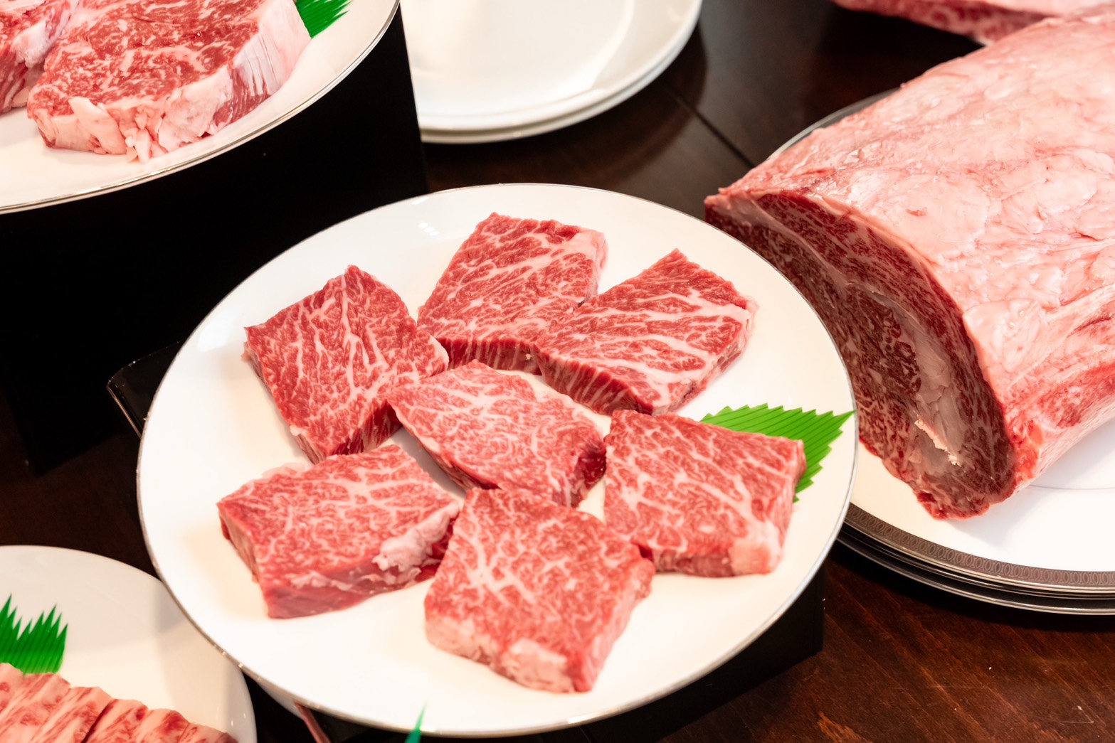 分切環節最能見證牛肉表現。龔振華現場拆開原廠包裝,大塊原肉已是修整後的狀態,他再細細修去脂肪,依肌肉紋理切開,根據部位適合的烹調方式切成厚片、薄片或骰子狀。King River 切下的肉片容易黏在刀上,龔振華說這是脂肪豐富的表現。隨著每次俐落下刀,牛肉斷面細密的大理石紋展現在眾人眼前。