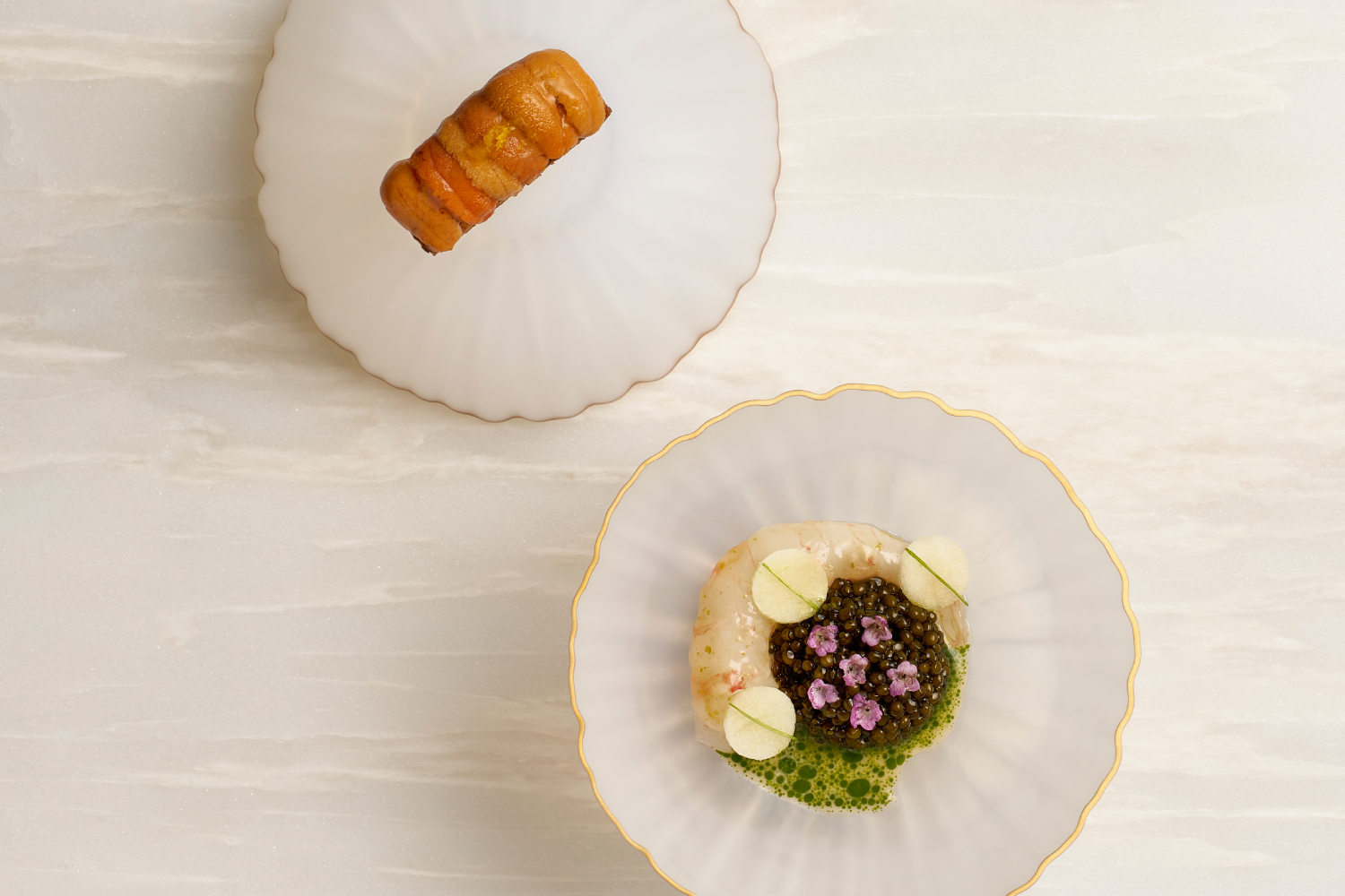 柚子胡椒牡丹蝦,搭配日式高湯凍與法式酸奶油,佐以 Maison Kaviari 魚子醬,並以柚子與青蘋果提鮮,一旁的馬糞海膽法式吐司(Pain Perdu)淋上焦化奶油椪醋,為整道菜式增添一抹濃郁的風味。