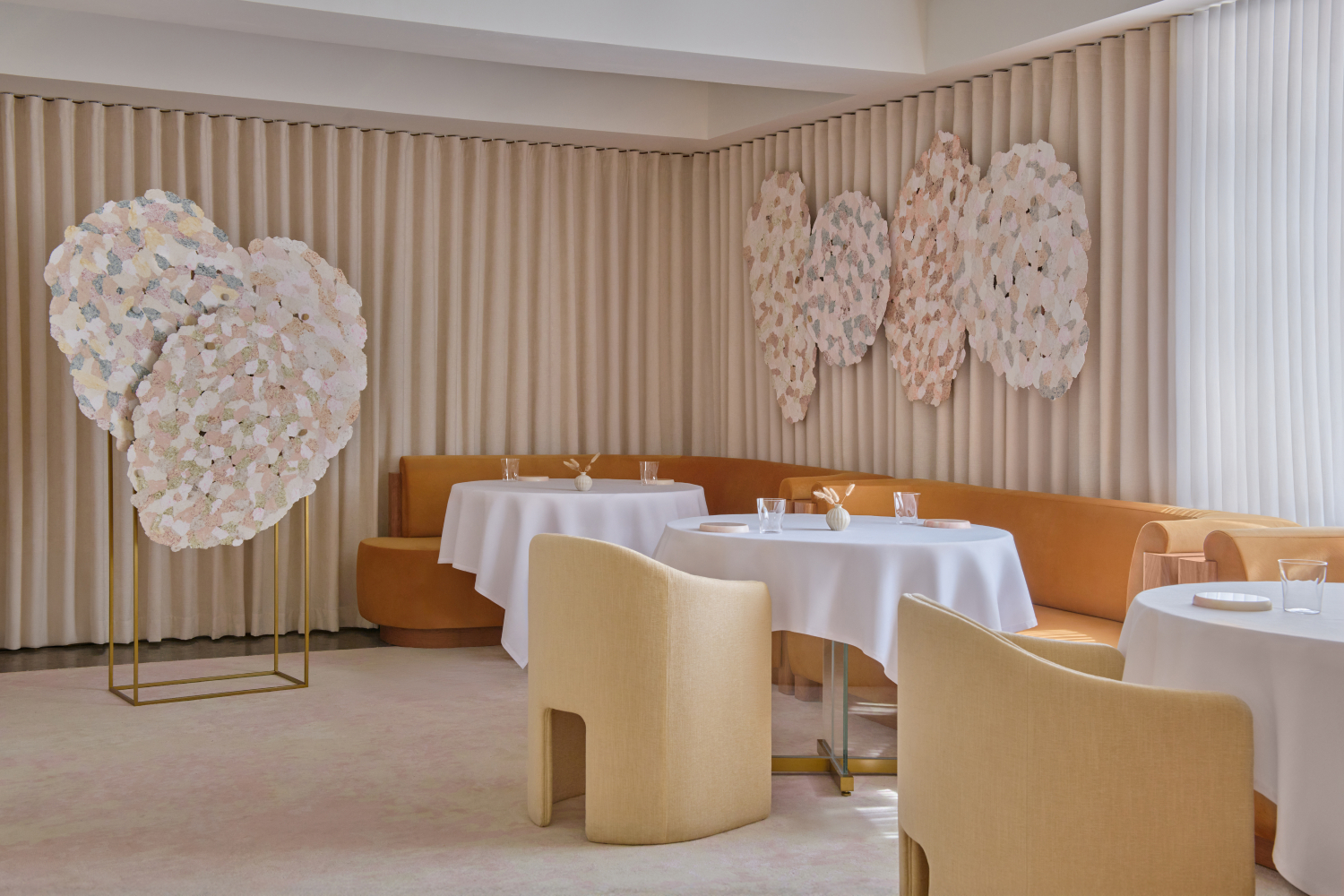 餐廳入口吊於空中的藝術裝置 Winter, Spring, Summer or Fall(2025)出自跨領域藝術家 Dawn Ng 之手,由層疊的碎紙片組成,取色自主廚 Julien 的季節食材──花瓣、樹葉、果實、根莖,以不同形態呼應著大自然的變幻莫測。正如季節更迭及口味的演變,此作品希望以短暫易逝的瞬間和感官體驗引發賓客的沉思。