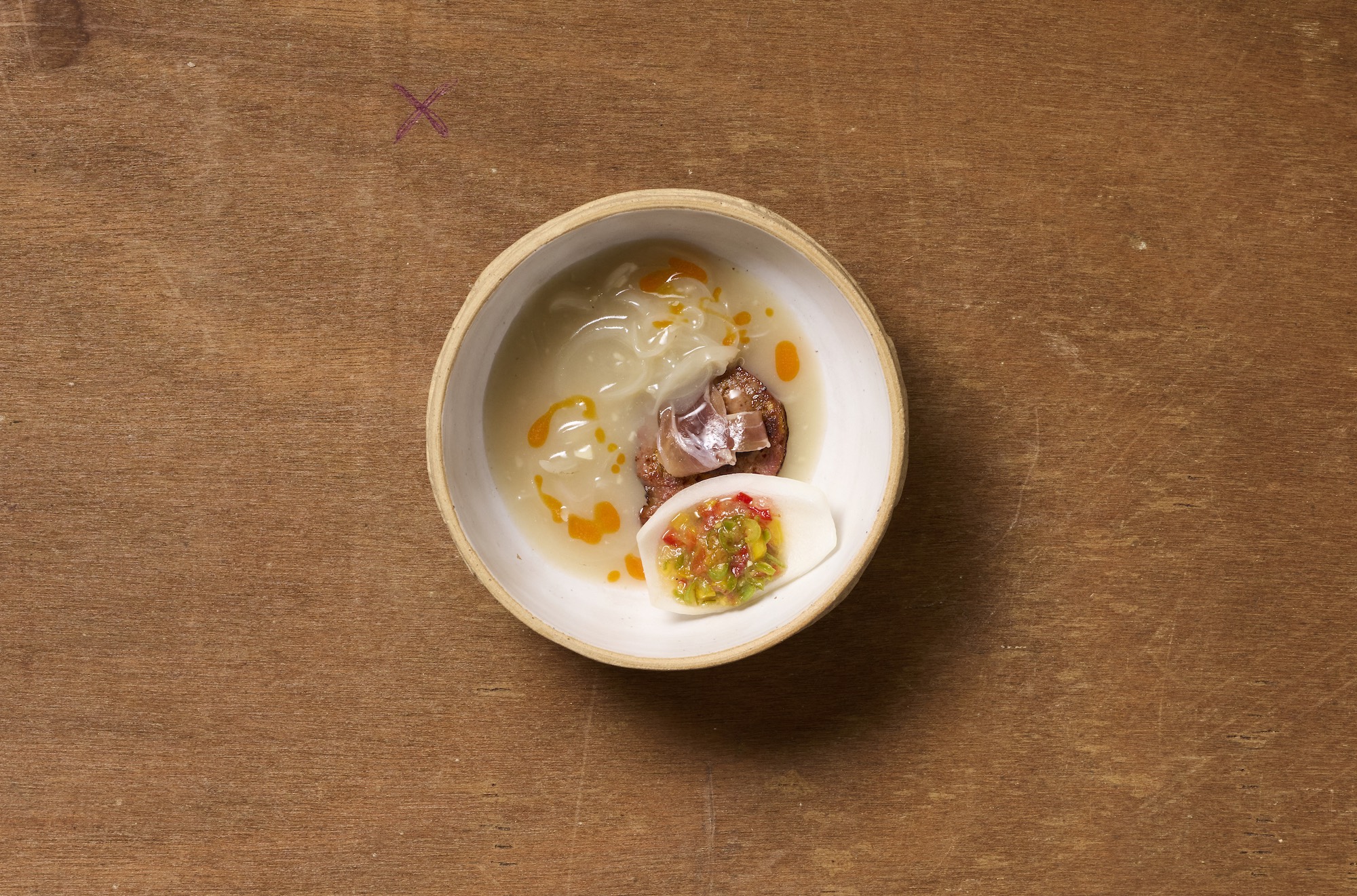 「鵝 / 椒 / 康普茶醋」以鵝骨架熬製湯頭,搭配用鵝脖子、鵝腿肉、鵝胗、柑橘皮、紅椒粉製成的鵝香腸,並以各式椒類的辛香和康普茶醋的酸度,完整保留辦桌「二路菜」的鮮味、酸味和香料味。圖片提供:好嶼 HOSU