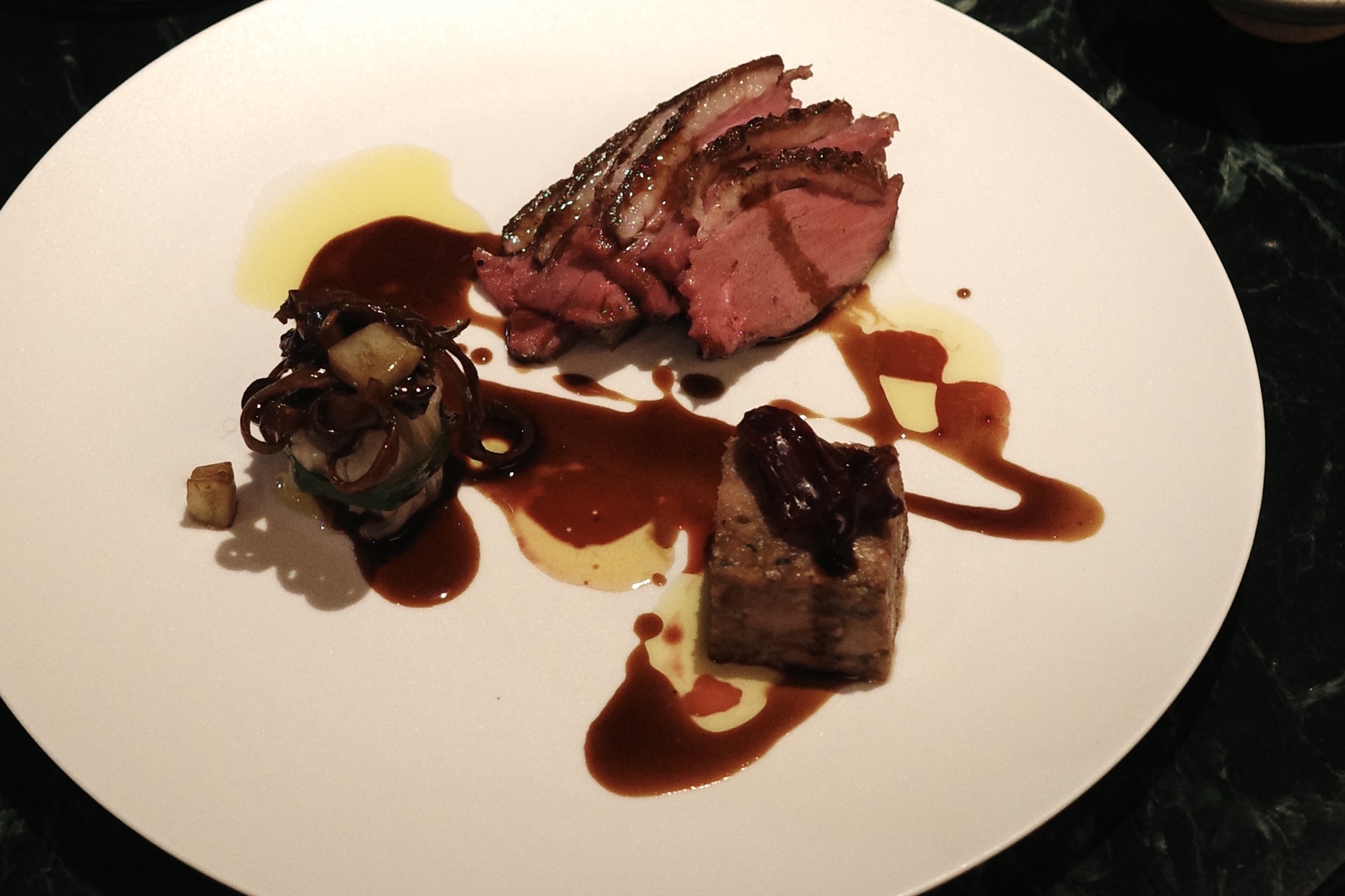 主餐「鵝 / 時蔬」嚴選雲林農場晃晃飼育鵝,以鵝肉小吃中常見的豆芽與韭菜作為配料,搭配炭火燒烤的鵝腸,及鵝掌和鵝腿製成的鵝肉凍,達成「菜單內循環」的永續理念。