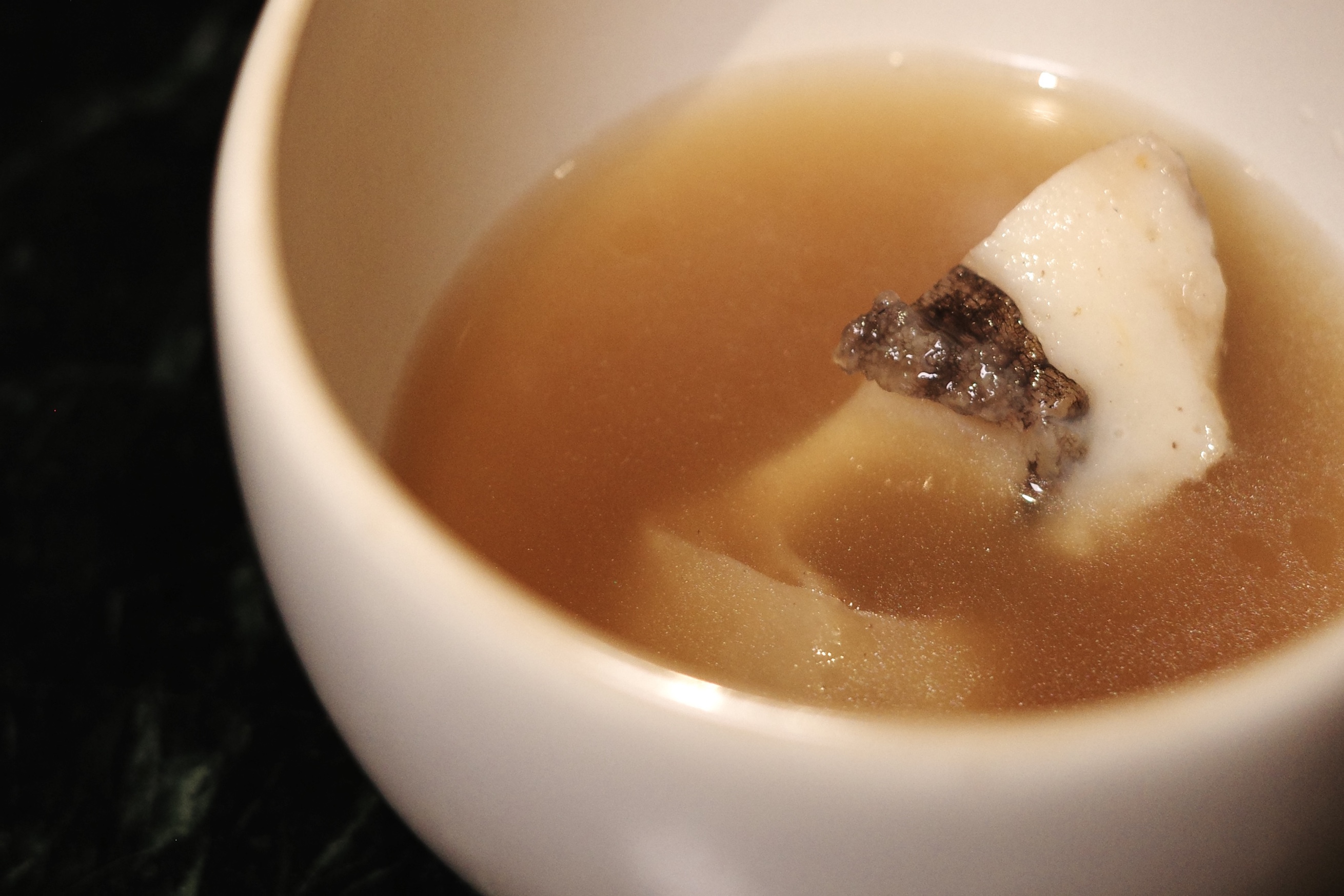 又或是這道「花膠|蕈菇|鮑魚」,以雞骨、白菜、竹筍、金華火腿、瑤柱與鮑魚等食材慢火細熬,「其實這些食材做出來,與佛跳牆的風味有些相似,但我不想跳進佛跳牆的框框。」刻意地讓湯頭保持清爽,風味依舊濃郁,煨出融合著海洋的鮮甜與土地的鮮韻。