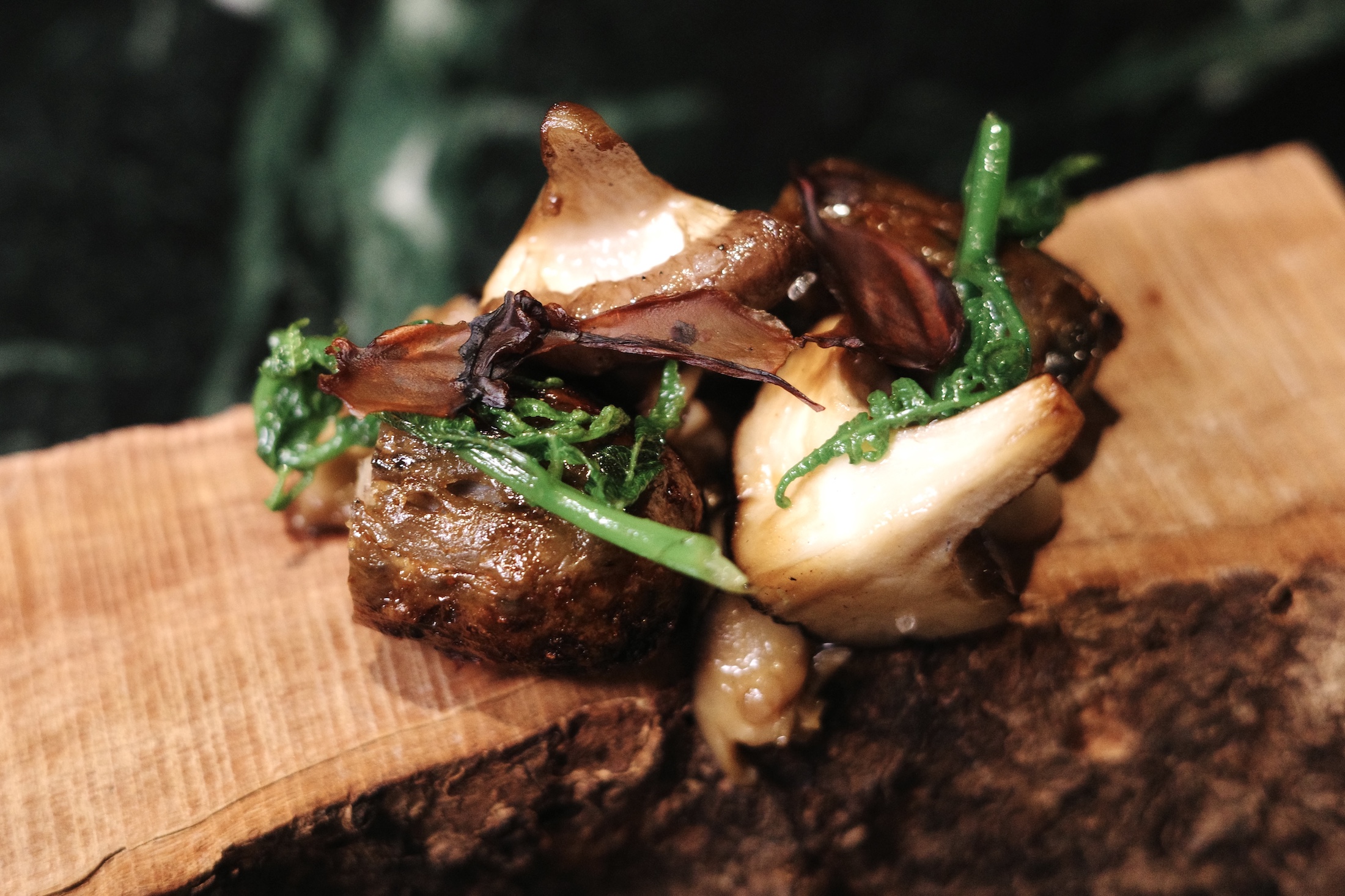 例如在「菇|菇|雞」這道菜中,他選用椴木香菇、柳松菇和鴻禧菇等 4 種當季的台灣菇類,以醃漬、發酵、風乾、炭烤等不同方式呈現菇的風味與質地。烏骨雞絞肉製成的香腸,口感類似日式雞肉丸,刷上菇與米麴調製的醬汁,肉汁與菇類的香氣在口中交融,鹹鮮四溢,即為李易晏從台灣風土中,提煉出來的「新台灣味」。
