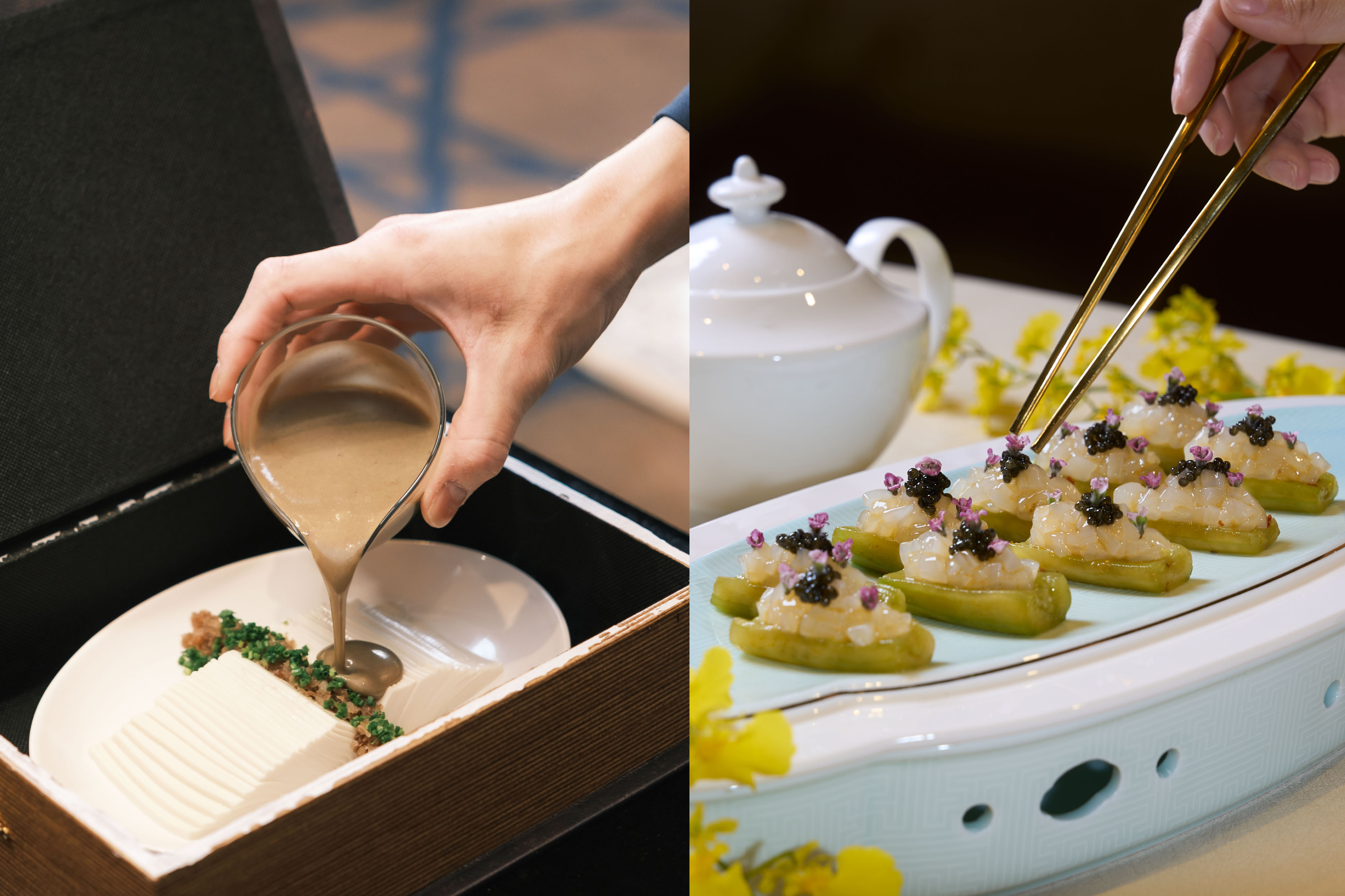 「福建海味香撈飯」採桌邊烹調,香濃的芡汁加熱到香氣四溢,再將芡汁連同刺參、北海道干貝等數十種珍貴食材淋到飯上。飯也不是一般的炒飯,廚師將白米先以雞湯蒸熟,再加入蛋白炒鬆。飯粒被芡汁浸潤得柔軟滑順,乾貨也將鮮味堆出豐富層次,這道主食讓胃口和味蕾都獲得滿足。