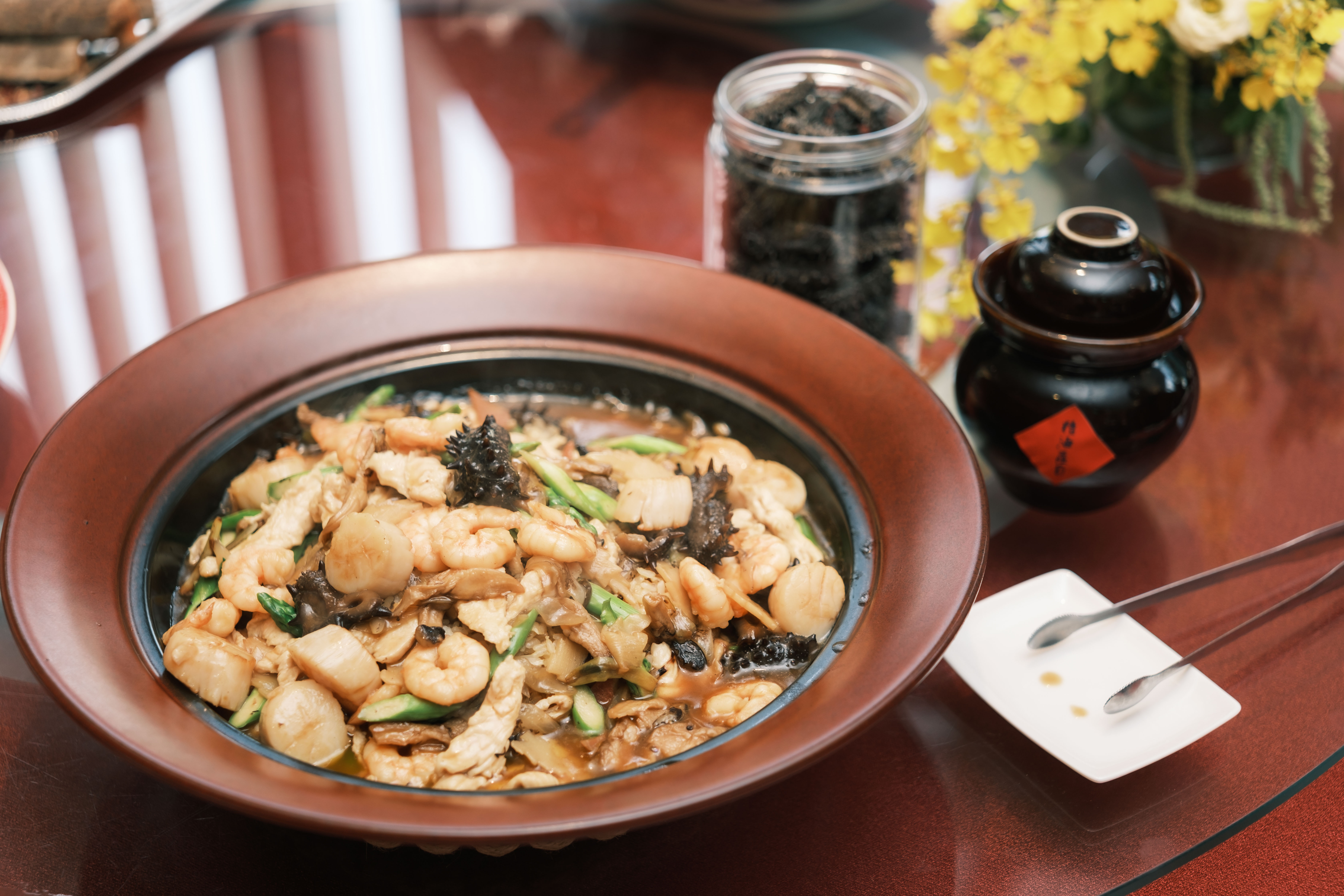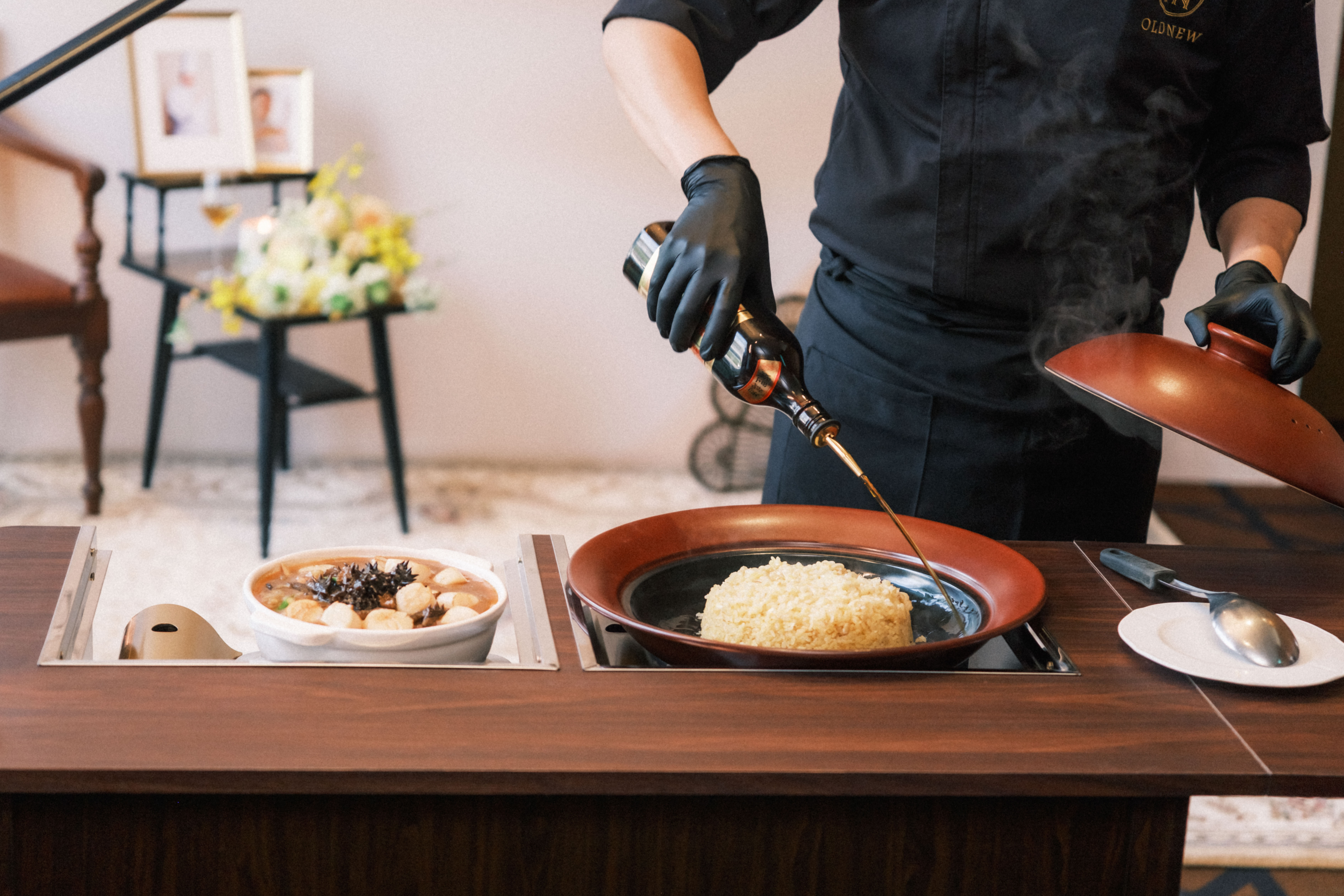 「福建海味香撈飯」採桌邊烹調,香濃的芡汁加熱到香氣四溢,再將芡汁連同刺參、北海道干貝等數十種珍貴食材淋到飯上。