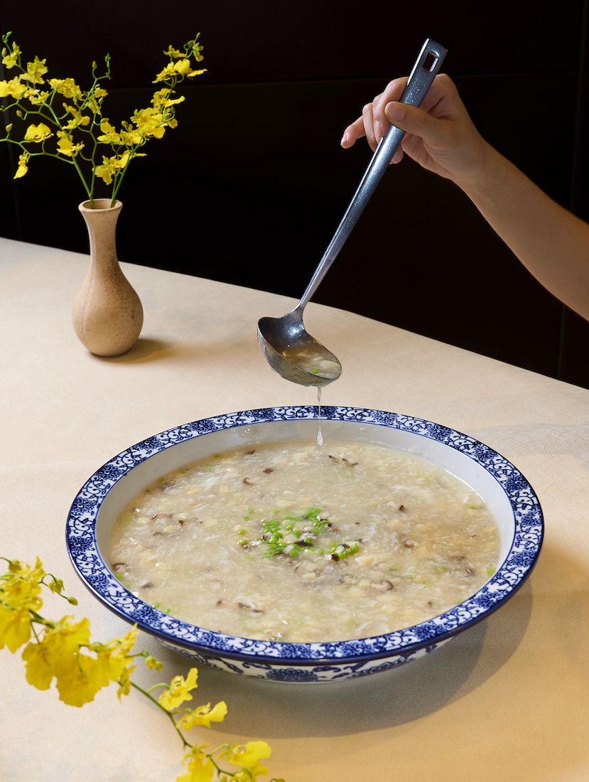 「拆燴雙筍鮮魚羹」結合江浙菜「拆燴黃魚羹」和「宋嫂魚羹」,滋味溫潤優雅,加上金華火腿末和鎮江香醋後,風味又變得立體起來。