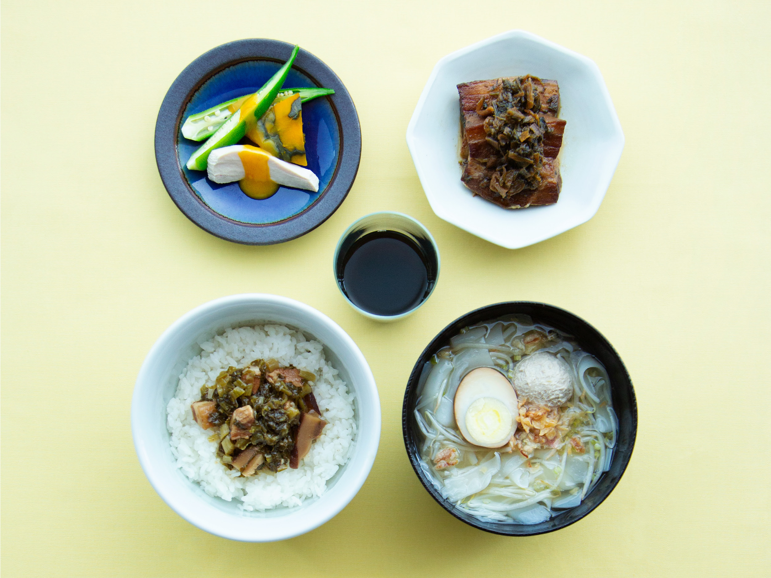 在東京 d47 食堂提供的新竹套餐。提供梅干扣肉、桔醬青菜和豬肉丸粄條。