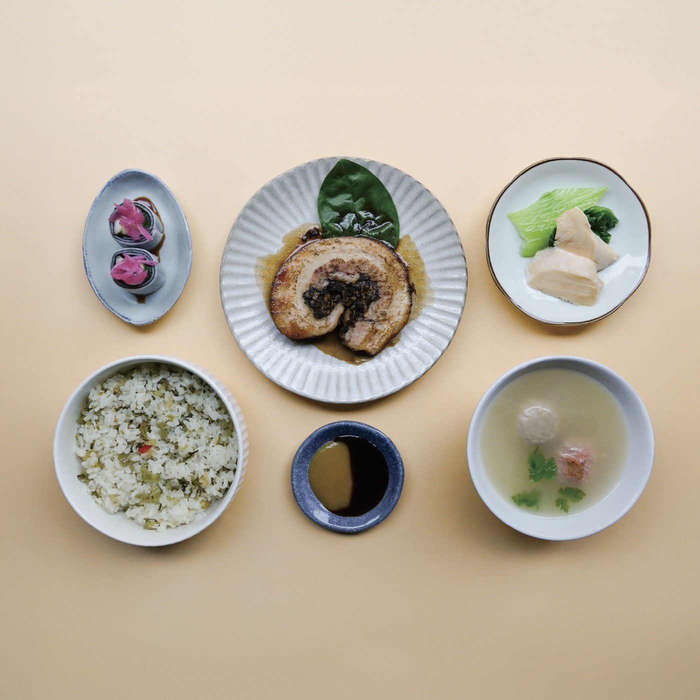而在新竹或者新州屋亮相的定食,黃湘絨以日式叉燒為靈感,用新竹黑豬肉捲入梅乾菜與北埔茶葉,油脂豐厚的水煮文昌雞蘸客家雙醬「醬油膏與桔醬」,主食是客家酸菜絞肉飯,以及用竹東純米粄條做成的「壽司卷」。
