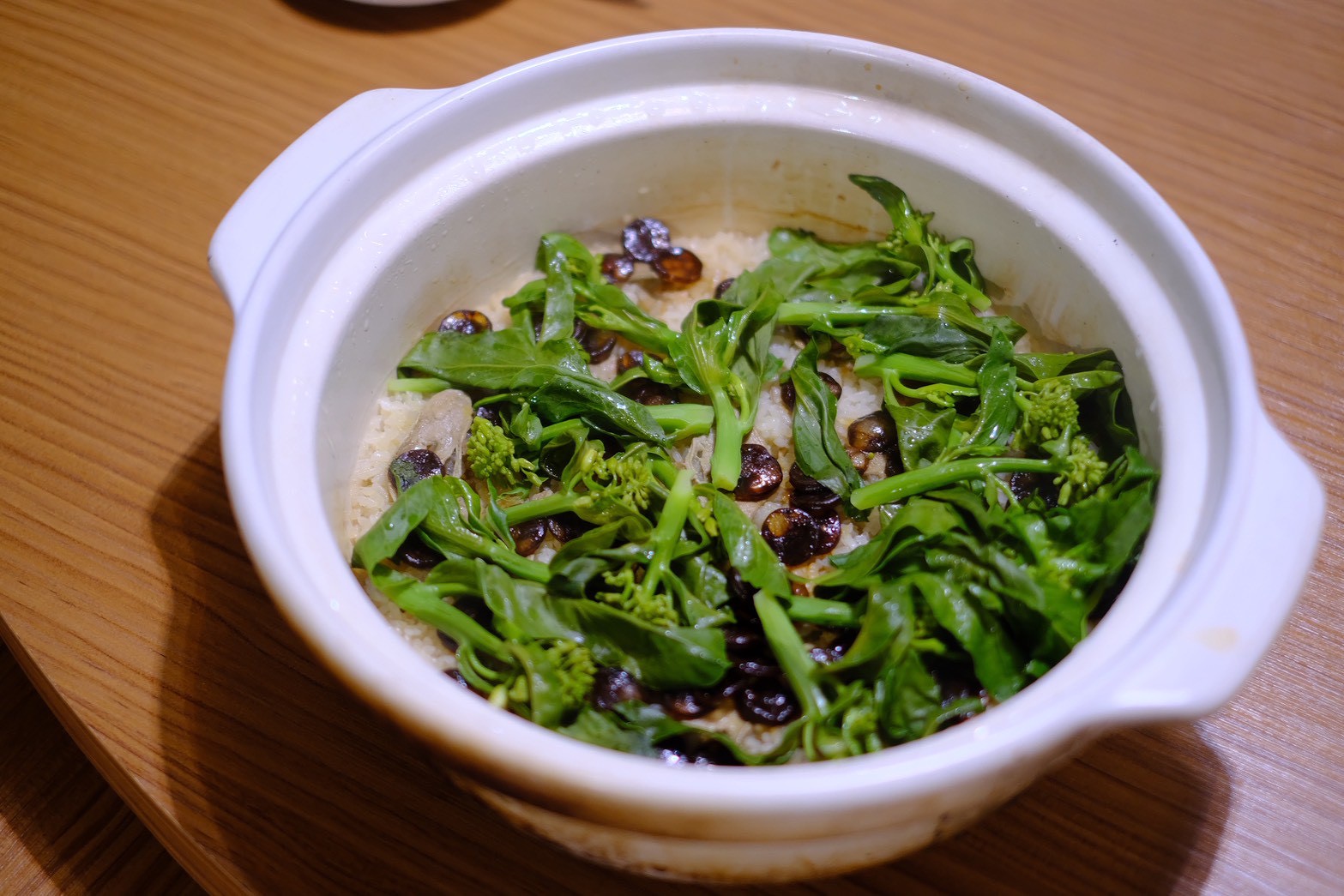 壓軸的主食「63 次法租界臘腸煲仔飯」,Adam 選用吸水性與香氣表現優異的新月米,在砂鍋裡的密閉循環中,每一粒米皆吸飽了港式臘腸釋放的油脂與醬香,形成濃郁而不厚重的質地,為春季新菜單畫下滿足的句點。
