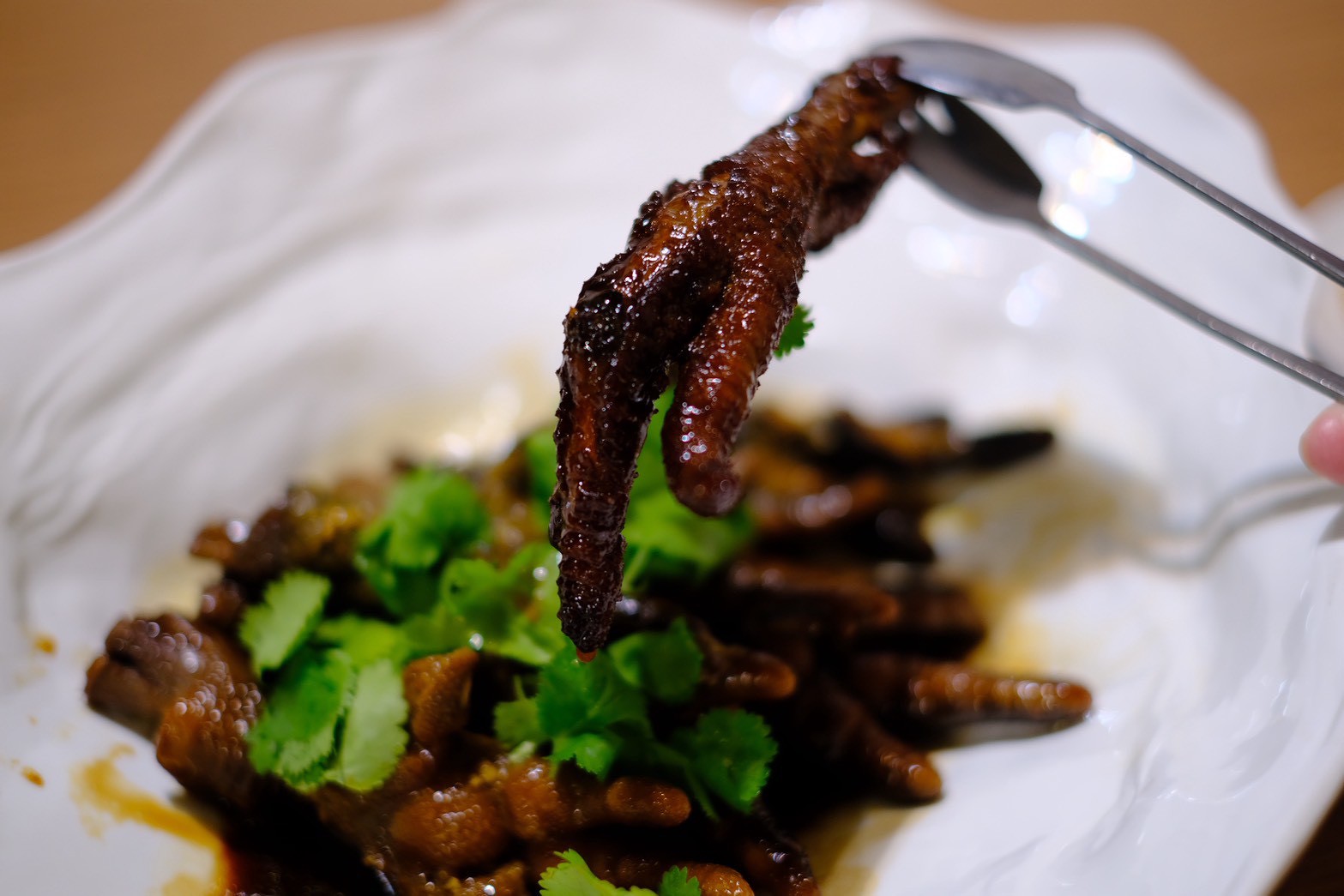 本季饗宴的開端,Adam 以「六味小菜」佈局了層次分明的味覺預演。其中法租界的招牌炭烤滷味,繁複的處理工序展現他對食材特性的深度理解——將究好豬的豬耳朵、豬頭皮及雞腳,透過汆燙、高溫炸出脆度,再經滷製與炭火收香,讓富含蛋白質的食材在梅納反應下產生迷人的木質焦氣。
