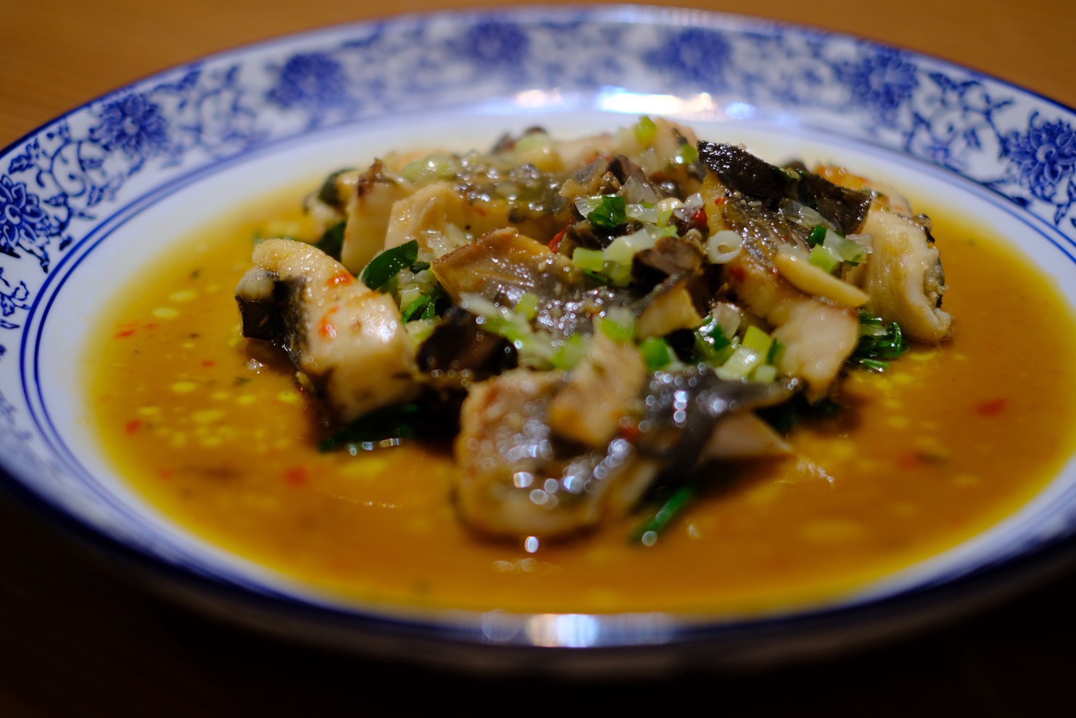 進入溫熱菜色,料理重心轉向火候與油脂的精密控制。「究好豬控肉炸春卷」保留傳統春卷樣貌,改將燉煮至膠質釋放的控肉切碎後包入春卷皮中,炸出外薄脆、內裡柔潤的反差感。「蒜子橄欖油燒海螺鮮魚」則向酒家菜「螺肉蒜」借來濃郁鮮醇,Adam 將當季海魚在傳統螺肉蒜醬汁中細膩烹調,並藉由海螺的彈性與山菜過貓的清新點綴,展現出回歸食材本質的純粹美感。