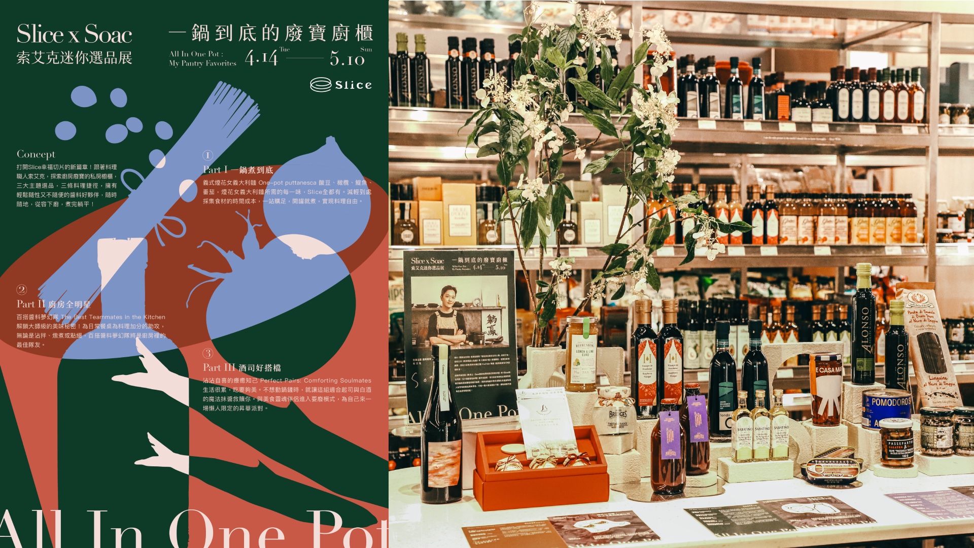 為解決大家的難題,實現大家心中那座私房食材櫥櫃的想像,Slice 特別邀請身兼電視節目主持人與飲食顧問的金鐘主廚索艾克(Soac),共同策劃一場以「一鍋到底」為主題的迷你選品展。儘管自稱是廚房廢寶,Soac 的烹調風格卻恰好符合歐陸的生活步調:隨性但不隨意。