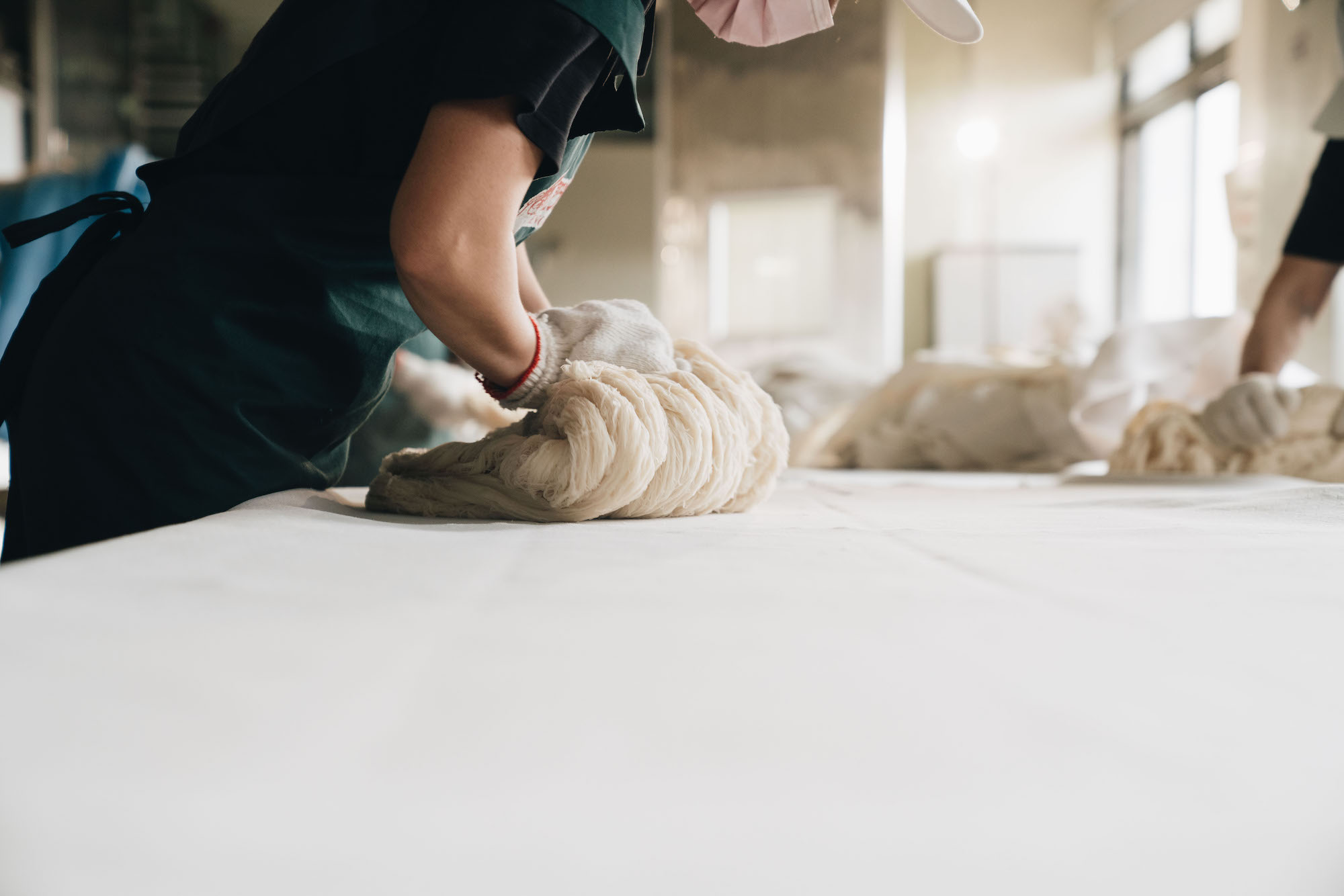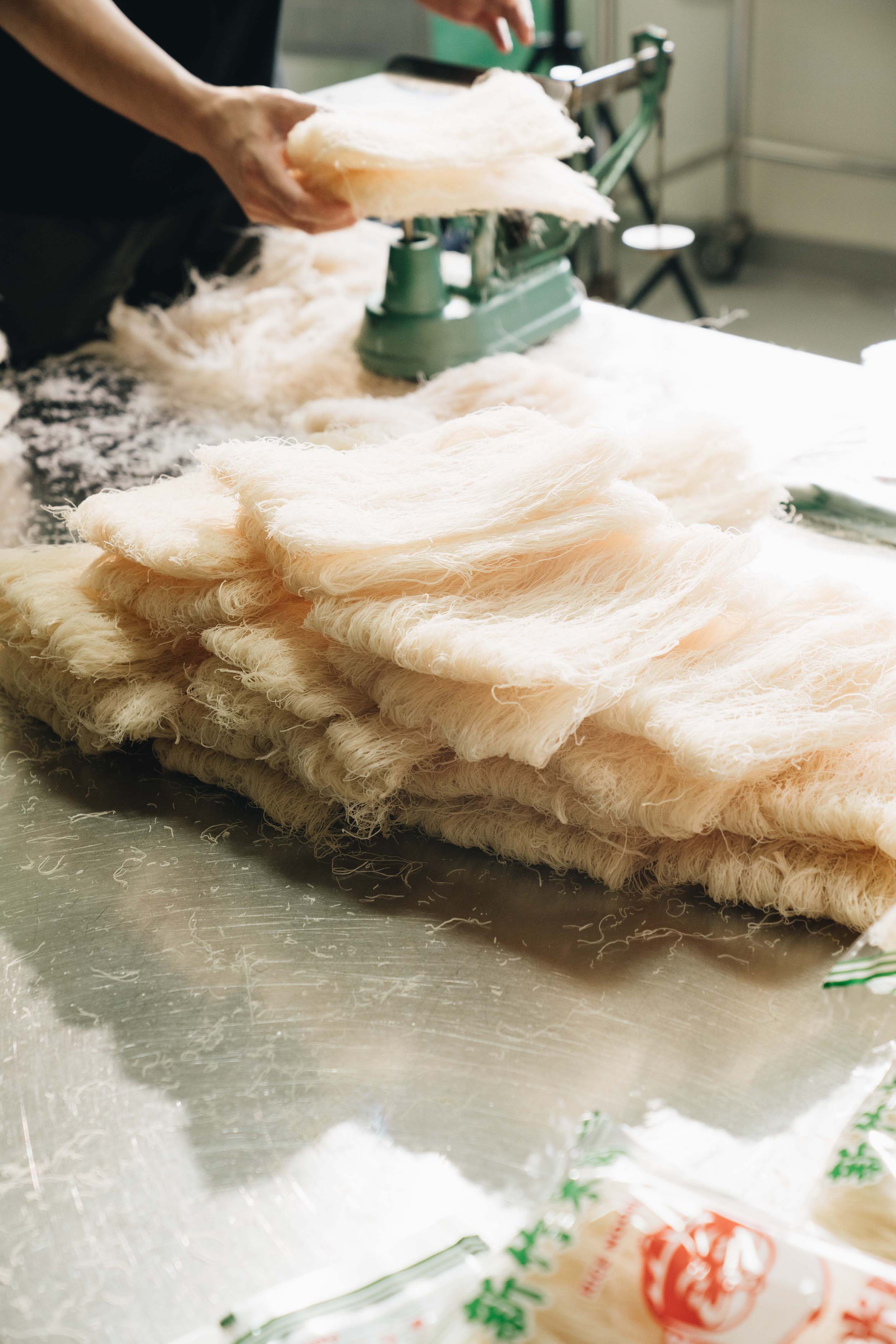 當蒸熟的粉絲出爐,接下來就是完全手工的步驟——將米粉搓揉、順絲、裁切、拆成適當大小、理成工整的四方形。裁剪前的米粉束,粗得如消防水管,還冒著熱氣。工作人員熟練地抓起米粉折疊搓揉、舉高往桌面甩打,好讓幼細的粉絲根根分明。