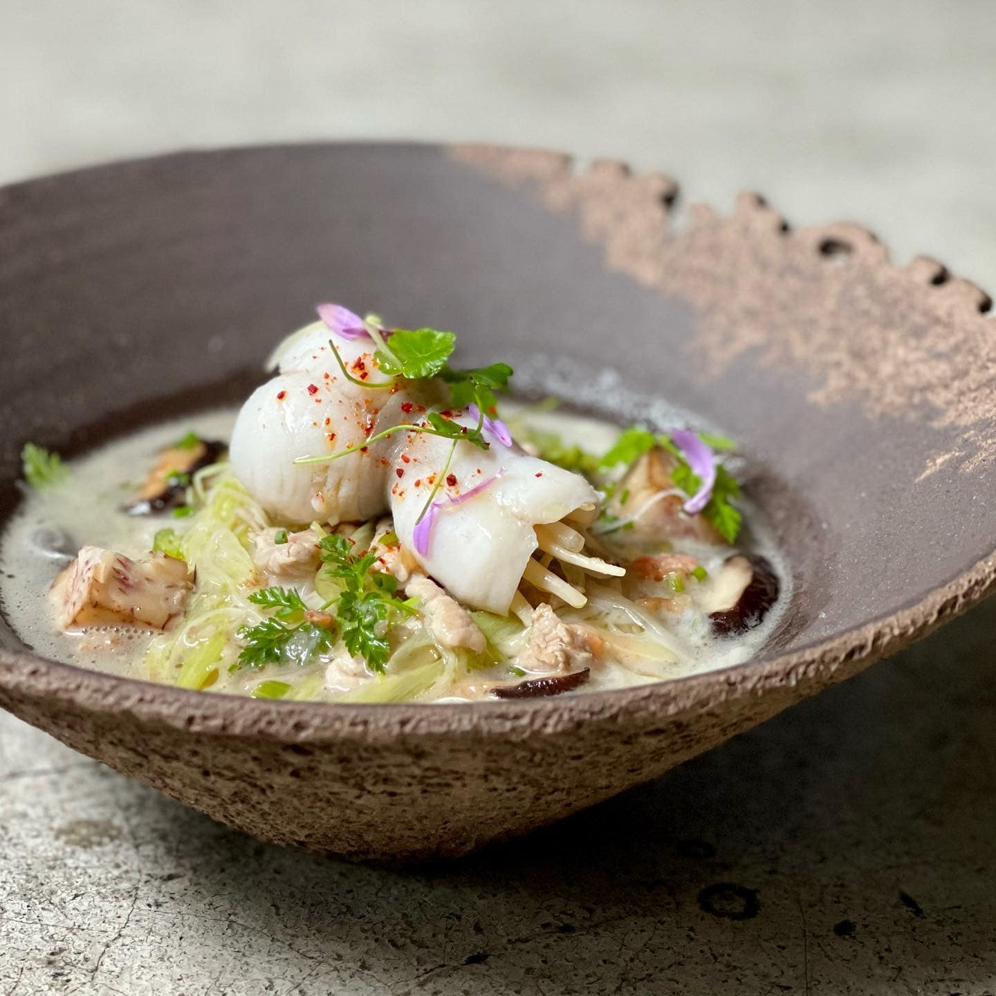 如台灣人熟悉的「白鯧米粉」,謝頤霖做出精巧的位上版本。他將泡開的米粉捲成球狀,用保鮮膜包起,直到要出餐前再回蒸。蒸熟的米粉放入白濁湯底中,再放上軟嫩的白鯧肉,讓軟 Q 的米粉與香醇的白鯧高湯交融,做出鮮美而不膩的精巧。